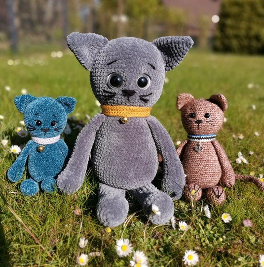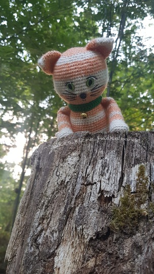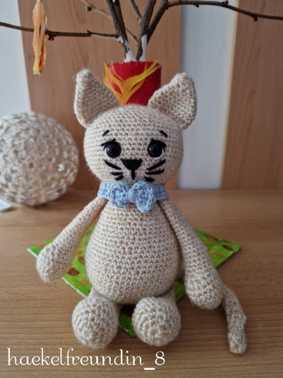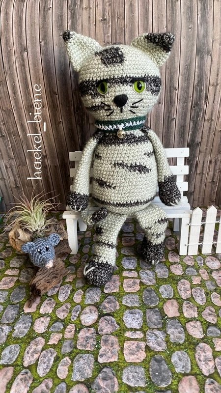Mit dem von mir verwendeten Garn (50g / ca. 130m Lauflänge) wird der Kater, im Sitzen gemessen, ca. 22 cm groß.