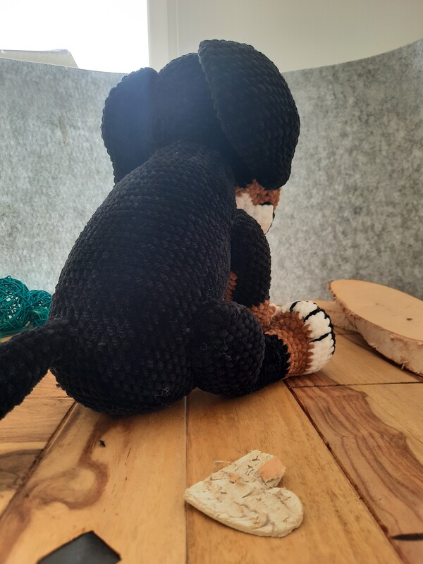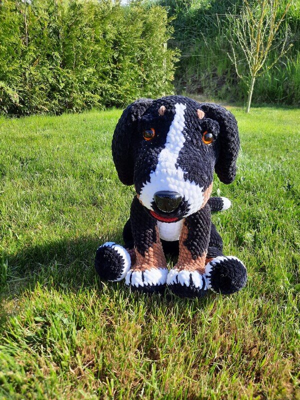 Sicherheit geht vor: Die Augen und die Nase des gehäkelten Berner Sennenhunds sind sicher und fest im Inneren verankert, sodass es keine Gefahr gibt, dass sie herausgerissen oder verschluckt werden können. So ist der gehäkelte Seppl auch bedenkenlos für Kinder geeignet.