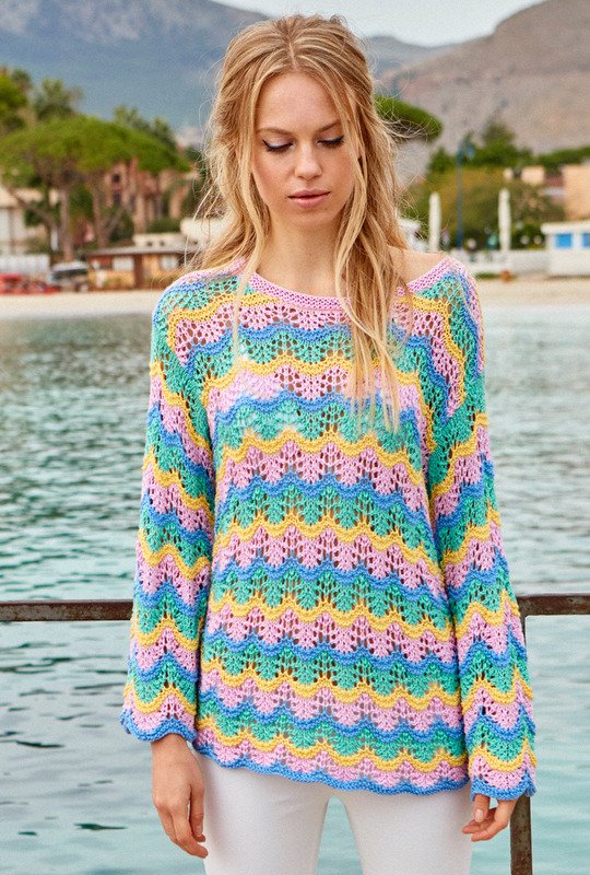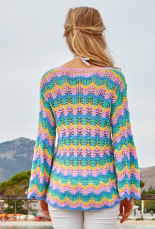 Bei diesem Pulli im Wellen- oder Pfauenmuster wechseln sich Streifen in Magnolie, Mint und Gelb harmonisch ab und betonen dabei noch den weichen Verlauf der Wellen. Als schönes Detail kommen noch die femininen Trompetenärmel hinzu – aus angenehmer Viskose gestrickt fallen sie ganz besonders weich und fließend! Das Muster ist nicht sonderlich kompliziert und wird ausführlich Reihe für Reihe in der Anleitung erklärt – ebenso die Streifenfolgen. Gestrickt wird in Einzelteilen, wobei es direkt nach dem Anschlag auch schon mit dem Farb- und Musterspaß beginnt. Bei den Abnahmen und Zunahmen sollte darauf geachtet werden, dass sich Umschläge und zusammengestrickte Maschen im Muster stets ausgleichen. Sind alle Teile fertig gestrickt, werden noch die Nähte geschlossen und der Halsausschnitt erhält noch seine kleine, kraus rechts gestrickte Blende. Am besten nimmt der fertige Sommerpulli jetzt noch ein kleines Bad und wird im Liegen getrocknet. Dabei schön in Form bringen und glattstreichen – so öffnet sich das Lacemuster und entfaltet seine ganze Pracht. Tipp: Dieser Pulli eignet sich auch ganz prima zur Resteverwertung, so lassen sich die Streifen ohne Problem schmaler oder breiter arbeiten – je nach vorhandenem Garnvorrat kann man auch mit den Streifen einen Farbverlauf kreieren.