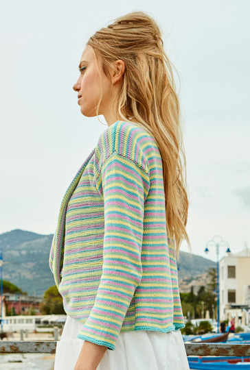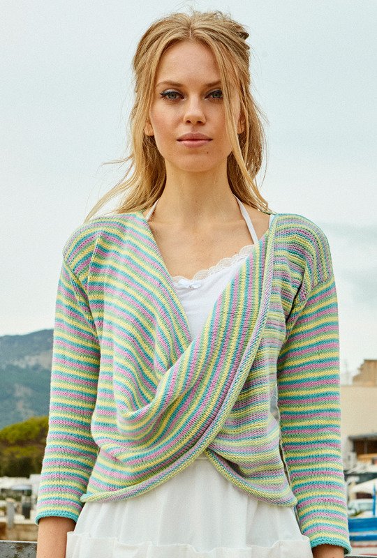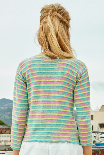 Lockere Kleidungsstücke sind die perfekten Begleiter für entspannte Freizeit-Looks. Wie dieser äußerst simple Ringelpulli, dessen Vorderteil einfach einmal um sich selbst gedreht wird und so den raffinierten Wickeleffekt entstehen lässt. Ganz einfach glatt rechts gestrickt entfalten sich die Streifen aus Hellgrün, Nelke, Gelb und hellem Petrol besonders schön und bieten oben drauf noch jede Menge Strickvergnügen. Das Rückenteil wird ebenso wie das Vorderteil einfach gerade hoch gestrickt - ganz unkompliziert. Nur bei den Ärmelschrägungen müssen Zunahmen gearbeitet werden, aber im glatt rechten Gestrick ist auch das ganz einfach. Der Wickeleffekt entsteht dann einfach durch einen kleinen, pfiffigen Dreh, während die Nähte geschlossen werden. Dann noch den rückwärtigen Halsausschnitt mit einer Reihe Krebsmaschen umhäkeln – das hält die Form und sieht schön sauber aus. Tipp: Dieser Pulli eignet sich auch ganz prima zur Resteverwertung – einfach der Kreativität freien Lauf lassen, denn auch aus ganz vielen Farben gestrickt, sehen die schmalen Streifen richtig gut aus.