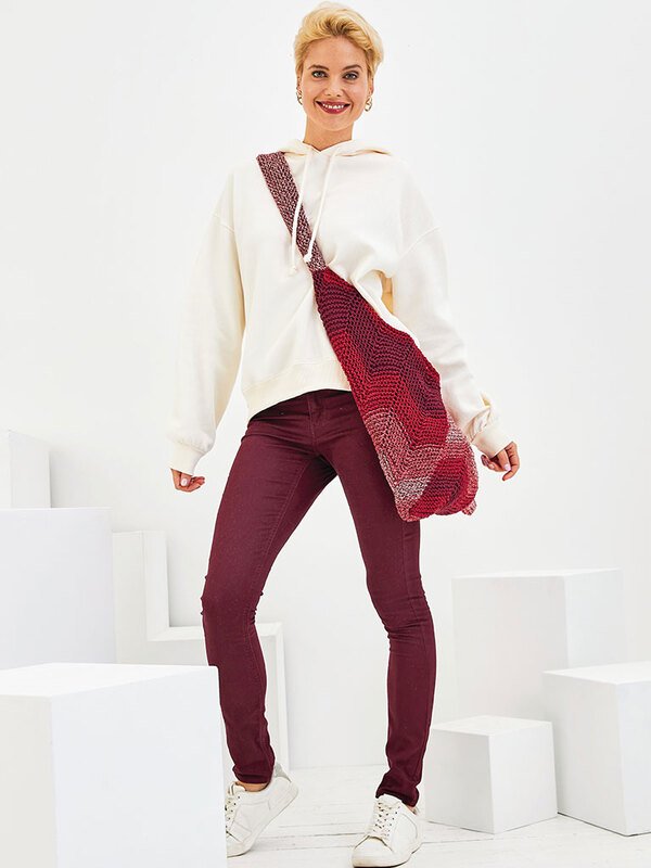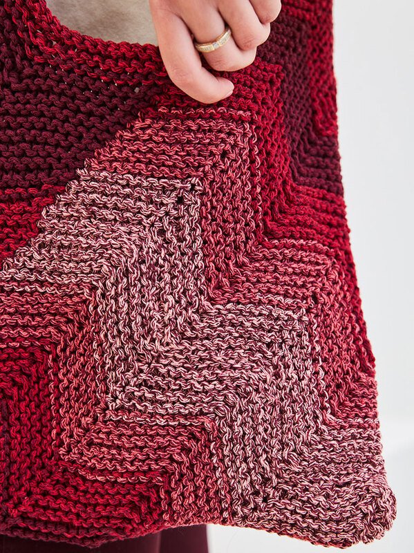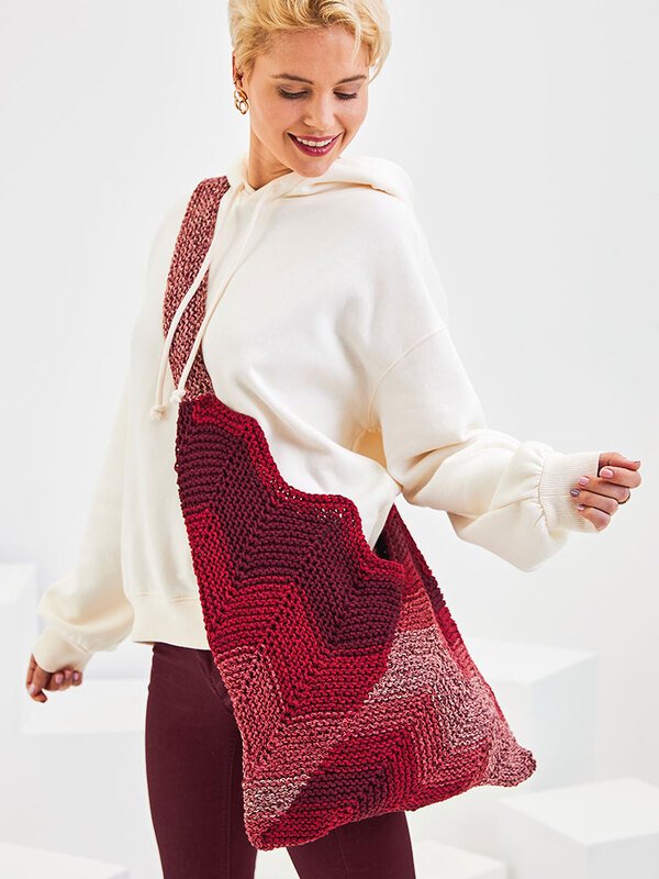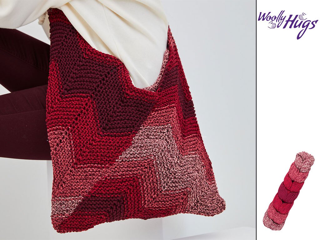 Taschen kann man nie genug haben! An einer so schönen großen Umhänge Taschen kommt man sowieso nicht dran vorbei. Diese hier ist aus einem besonders strapazierfähigem Garn, der Woolly Hugs ROPE PLAIT gestrickt. Auf dem ersten Blick sieht man nicht, wie sie gemacht wurde. Darum versuche ich das ein wenig zu beschreiben. Es ist ganz einfach, wir stricken nur mit rechten Maschen eine "L"-Form, nehmen aber an bestimmten Stellen Maschen zu und an anderen Stellen wieder ab. So entsteht die Zacken. Der Trick kommt aber beim Zusammennähen der Tasche. Die wird nach einem Schema (steht genau in der Anleitung beschrieben) gefaltet.
