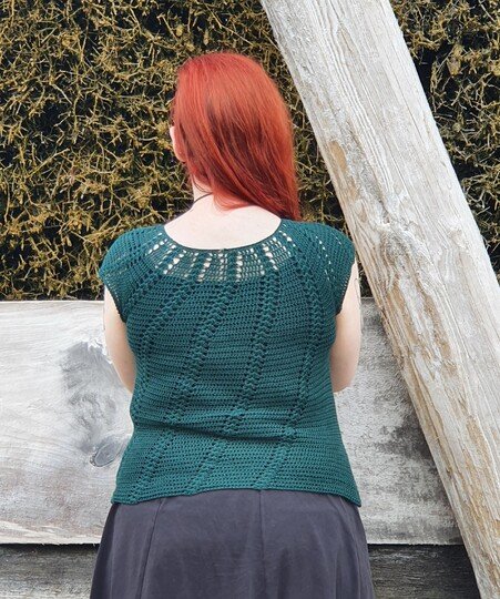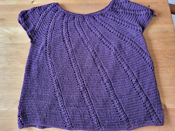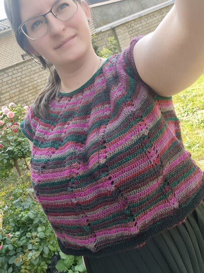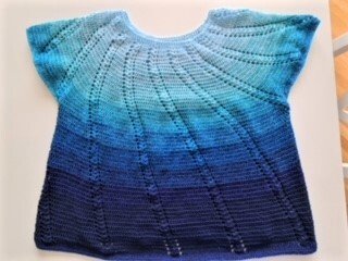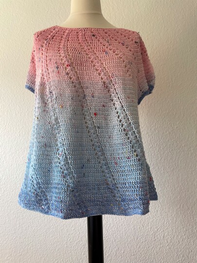 Es wird als Rundpasse von oben nach unten in einem Stück gehäkelt, ohne extra Ärmel. Somit eignet es sich auch perfekt für Farbverlaufsbobbel. Und ihr müsst am Ende keine Einzelteile vernähen.