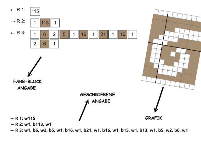 -farbige Zahlen-Blöcke für jede Reihe für feste Maschen (Stb od. hStb)