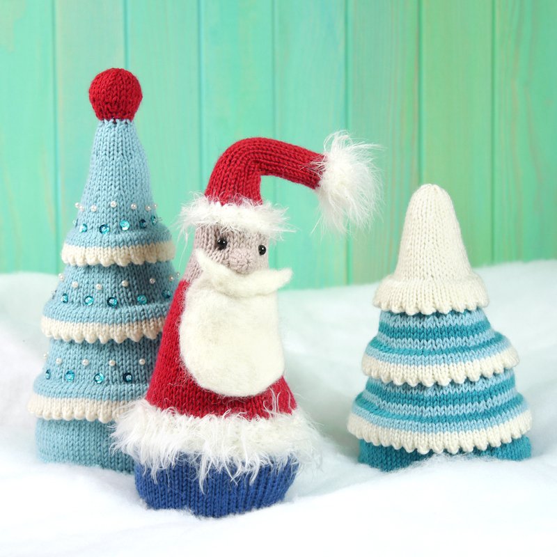 Weiche Weihnachten stehen Ihnen mit diesen wolligen Weihnachtsbäumen ins Haus! Zudem sind Bäume und Weihnachtsmann wunderbar zur Resteverwertung geeignet, bei denen man munter die unterschiedlichsten Wollqualitäten mischen kann – als Dekorationsstücke gedacht, brauchen sie nicht waschbar zu sein. Ich habe deshalb ausnahmsweise auch keine Garnempfehlung ausgesprochen. Ihre Lieblingsfarben tummeln sich ohnehin in der Restekiste, oder?