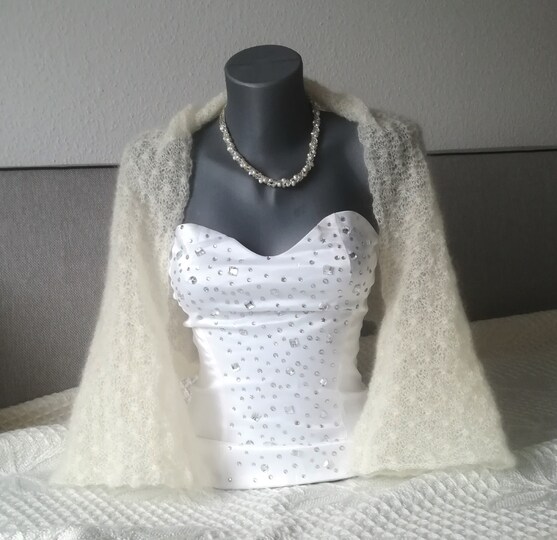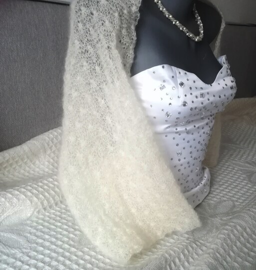 Ein federleichtes, aus hauchfeinem Lacegarn gestrickter Ärmelschal oder Ärmelstola für die Braut oder auch zu jedem anderen festlichen Anlass.