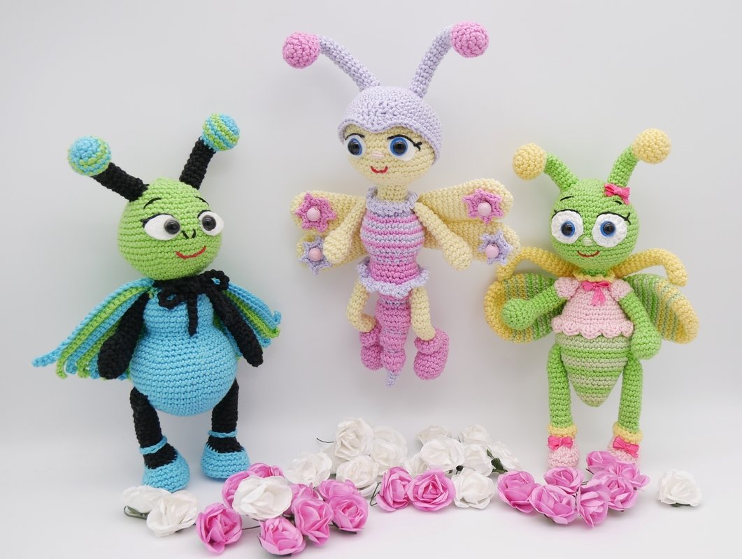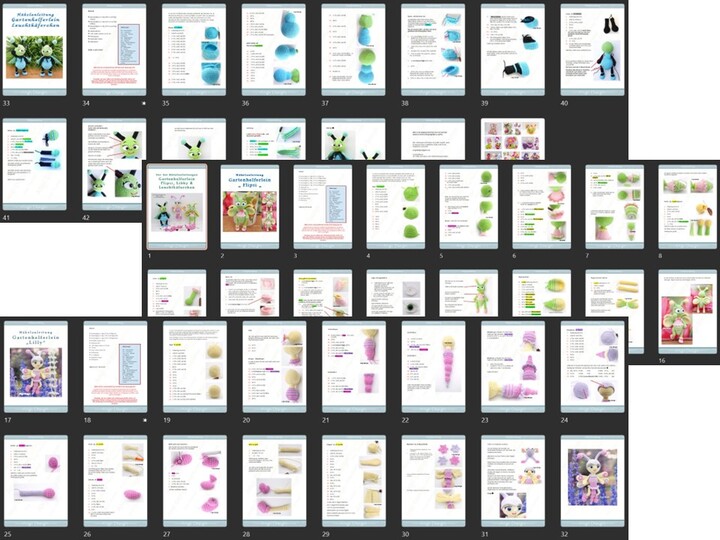 Du erhältst 3 vollständige Anleitungen aus der Serie die " Gartenhleferlein " Flipsi, Libby & Leuchtkäferchen.