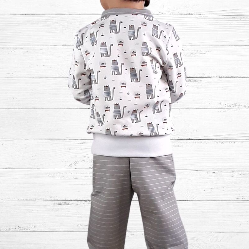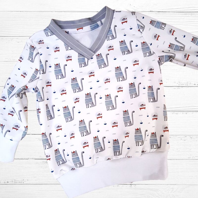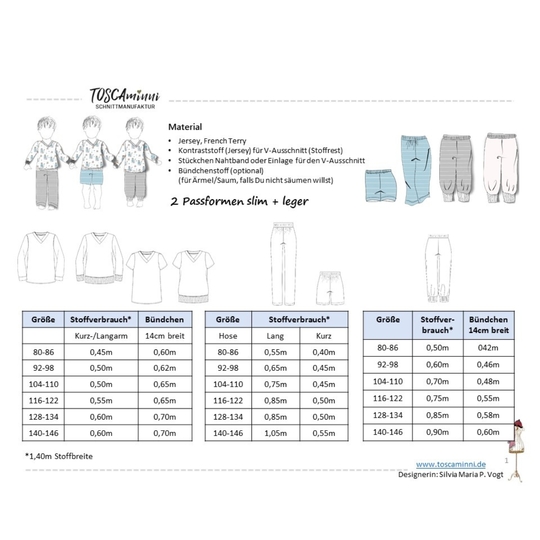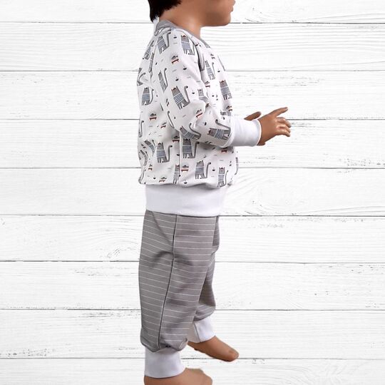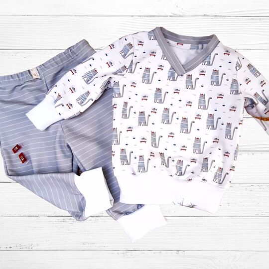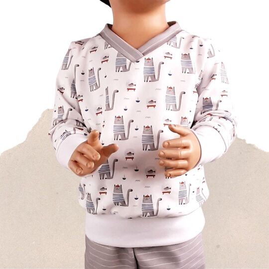 Mit dem Schnittmuster-Set Leeroy nähst Du ein cooles Schlafanzug-Set bestehend aus einem Shirt mit V-Ausschnitt für Jungs. Das Shirt kannst Du mit Bündchen oder mit Saum in kurz- oder langarm nähen.