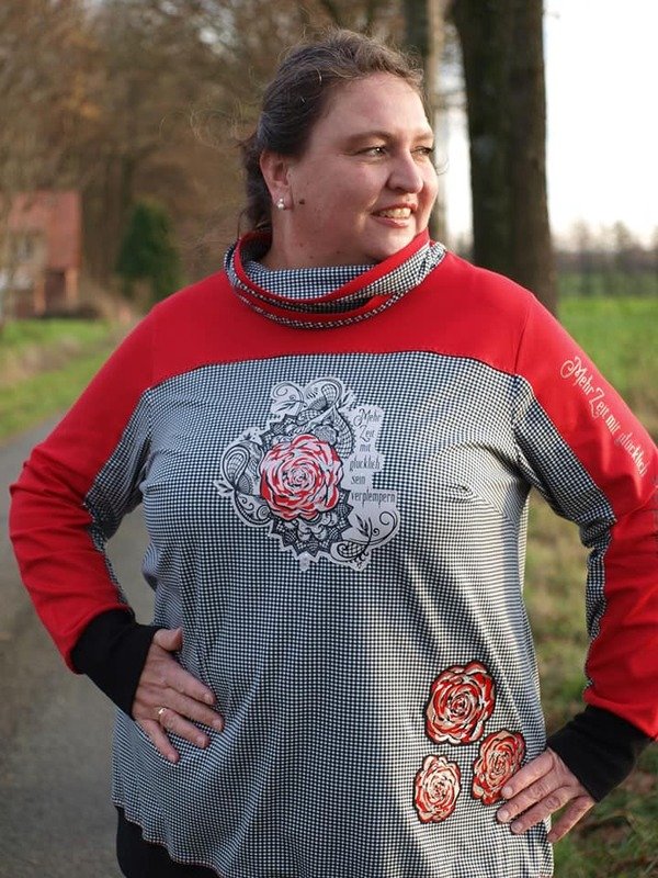 Die Grundidee dieses Schnittmusters ist eine Sweatjacke mit einer Teilung im oberen Brust- und Rückenbereich, sowie im Armbereich. Das macht optisch einiges her. Du kannst damit aber auch super Stoffreste oder Panele oder Paspeln verarbeiten.