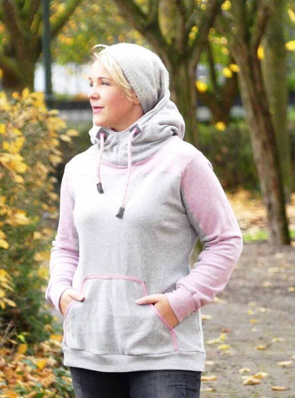 Du kannst zwischen Reißverschlusstaschen bei der Jacke und einer Känguru-Tasche wählen. Im Schnittmuster sind eine Kapuze und ein Loop-Kragen enthalten und für den Pullover auch ein Halsbündchen.