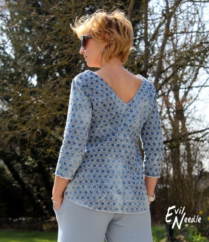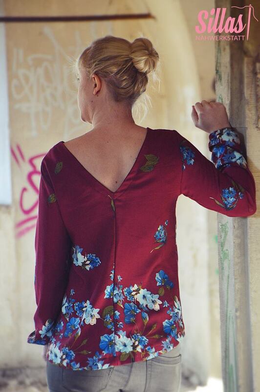 Das Kleid und die Bluse sind auf Webware ausgelegt. Den Halsabschluss kannst Du vorne und hinten mit einem V-Ausschnitt oder mit einem Rundhalsausschnitt nähen, der mit einem Beleg abgeschlossen wird. Beide Varianten können miteinander kombiniert werden. Vor allem im Rücken macht der V-Ausschnitt eine Menge her.