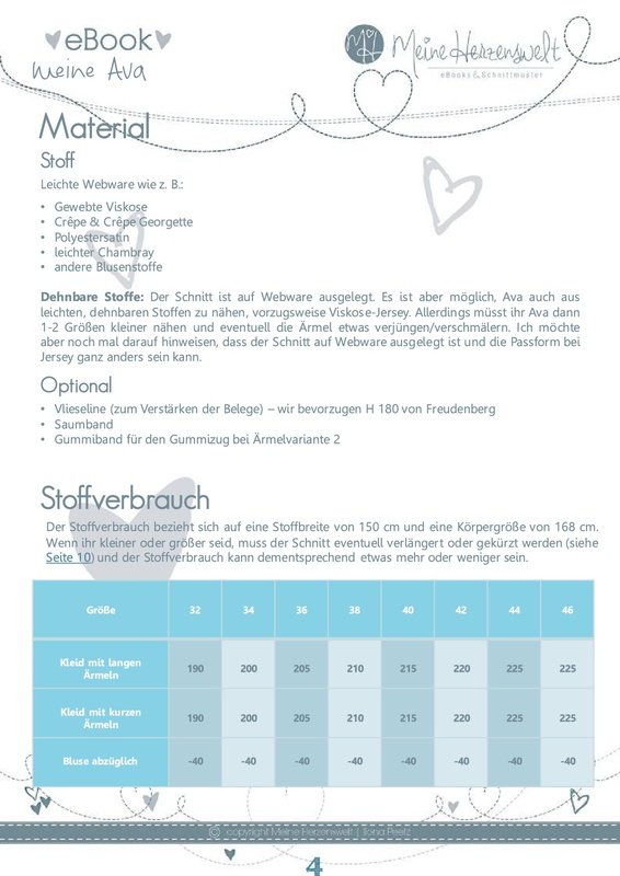 Das Kleid Ava ist auf leichte Webware ausgelegt wie z.B. gewebte Viskose, Polyestersatin, leichten Chambray, Crépe, Crépe Goergette oder andere Blusenstoffe.