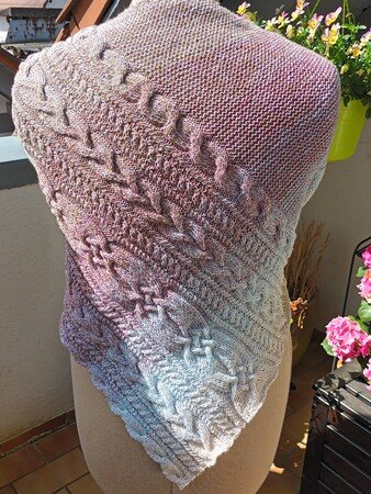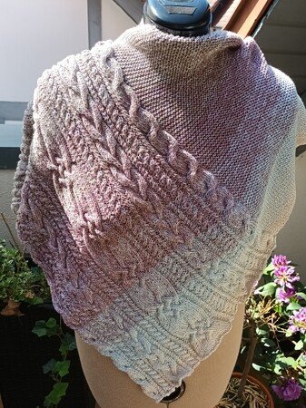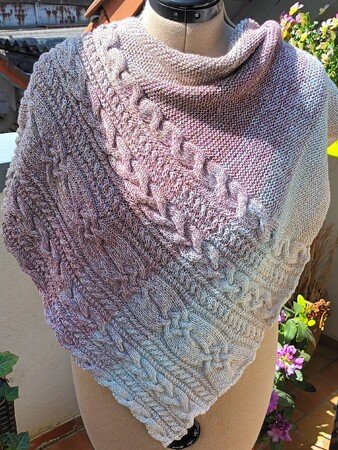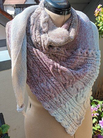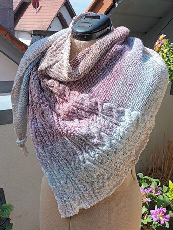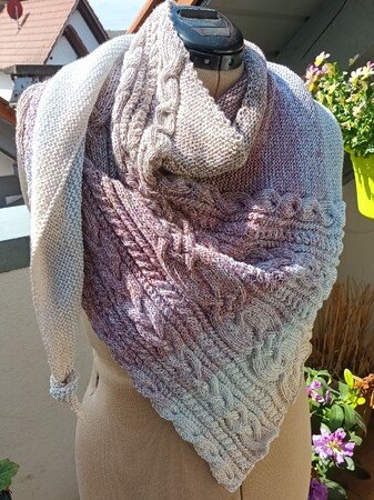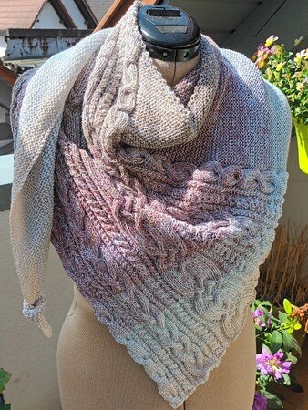 „Nordish“ ist ein asymmetrisches Dreieckstuch mit einem breiten Musterstreifen, bestehend aus verschiedenen Zöpfen. Der Eyecatcher ist ein breiter keltische Zopf in der Mitte.