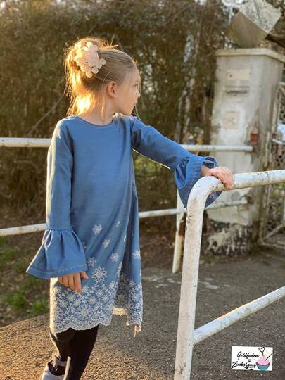 Das Kleid Ava ist auf leichte Webware ausgelegt wie z.B. gewebte Viskose, Polyestersatin, leichten Chambray, Crépe, Crépe Goergette oder andere Blusenstoffe.