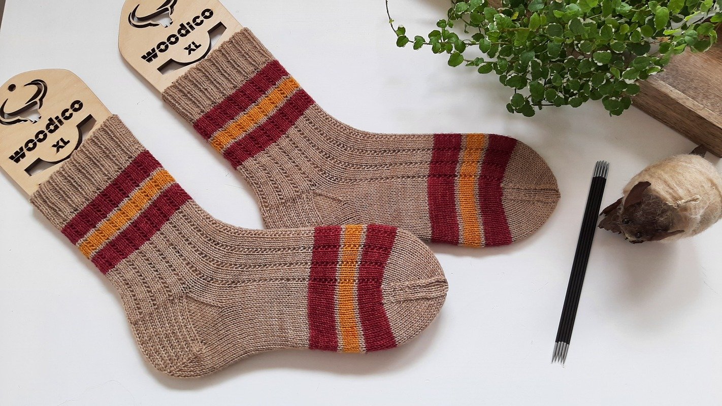 Das einfache Rippenmuster verleiht dem Socken eine angenehme Passform. Für die Optik werden am Schaft und am Fuß einfache farbige Streifen eingearbeitet.