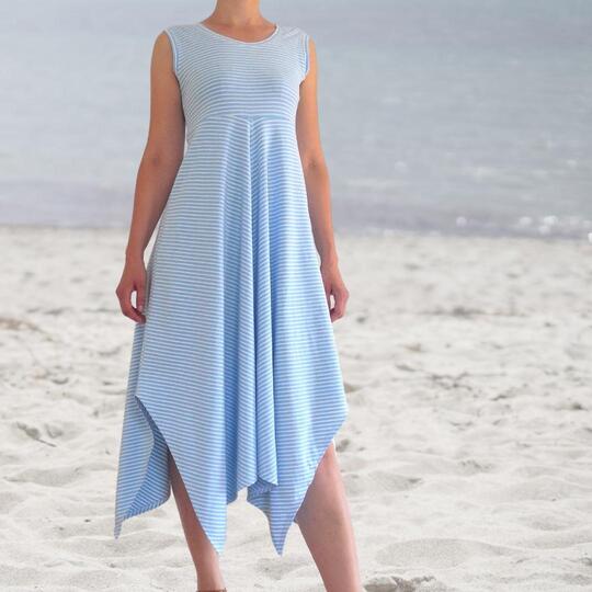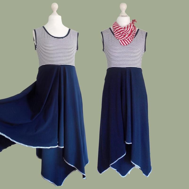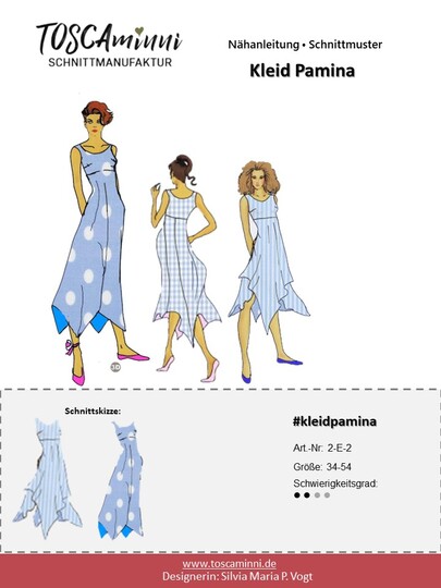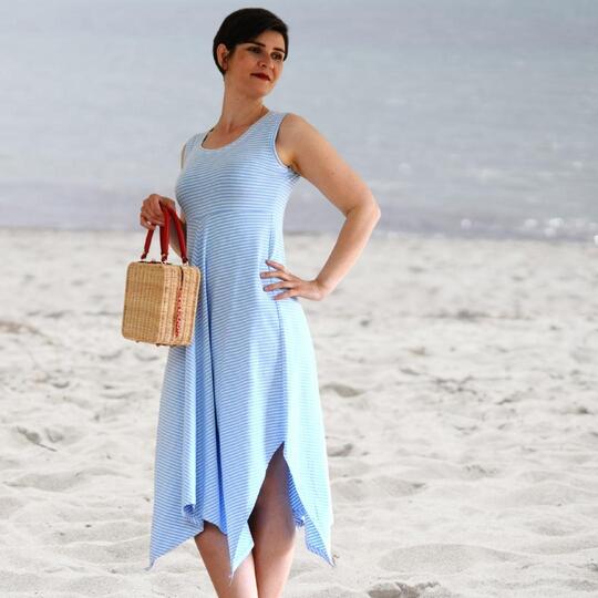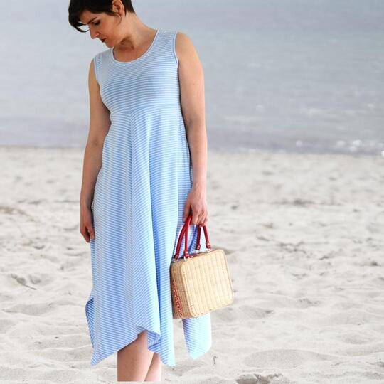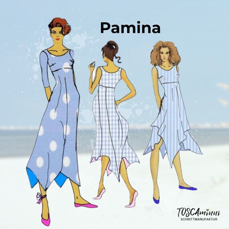 Das Schnittmuster Pamina ist ein extravagantes Sommerkleid aus Jersey genäht. Das Oberteil ist ärmellos und im Empiretil gehalten. Dadurch wäre es auch als Schwangerenkleid vorstellbar.