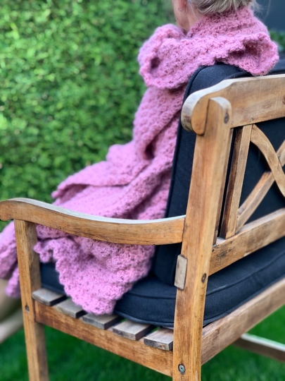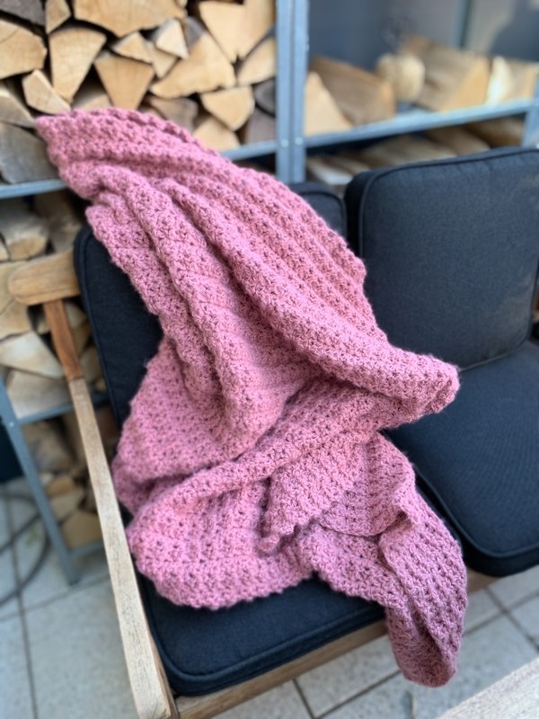 Die superweiche Decke hat durch ihr Muster aus festen Maschen und Stäbchen eine romantische Optik und umschlingt dich gemütlich. Sie ist für kühle Tage oder Abende eine wärmende Hülle. Durch die Verwendung eines „haarigen“ Garnes, kann mit großer Häkelnadel gehäkelt werden und ein Fortschritt ist schnell zu sehen.
