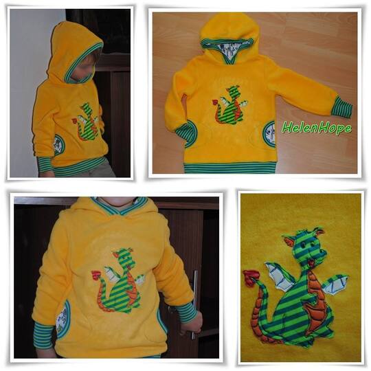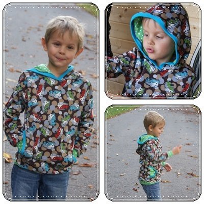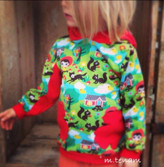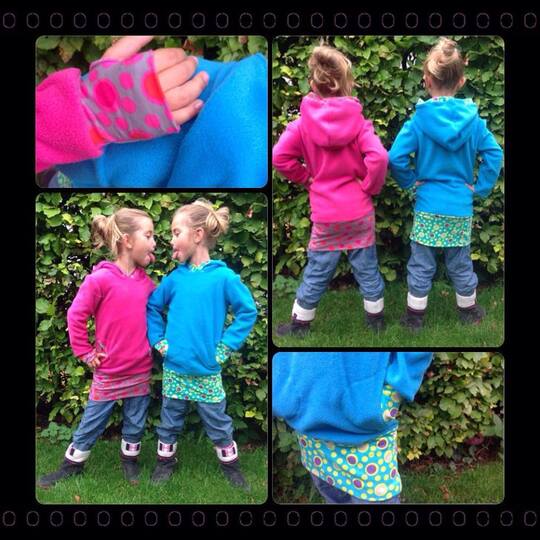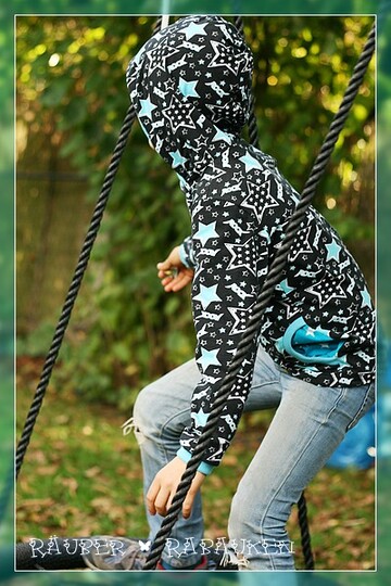 Stoffen genäht werden kann. Der Pulli hat eine lässig große Kapuze.
