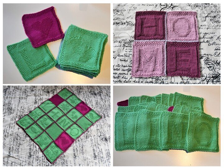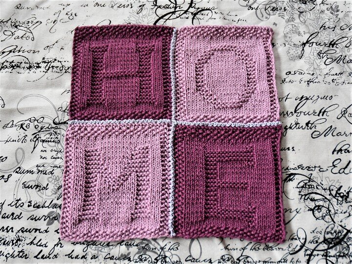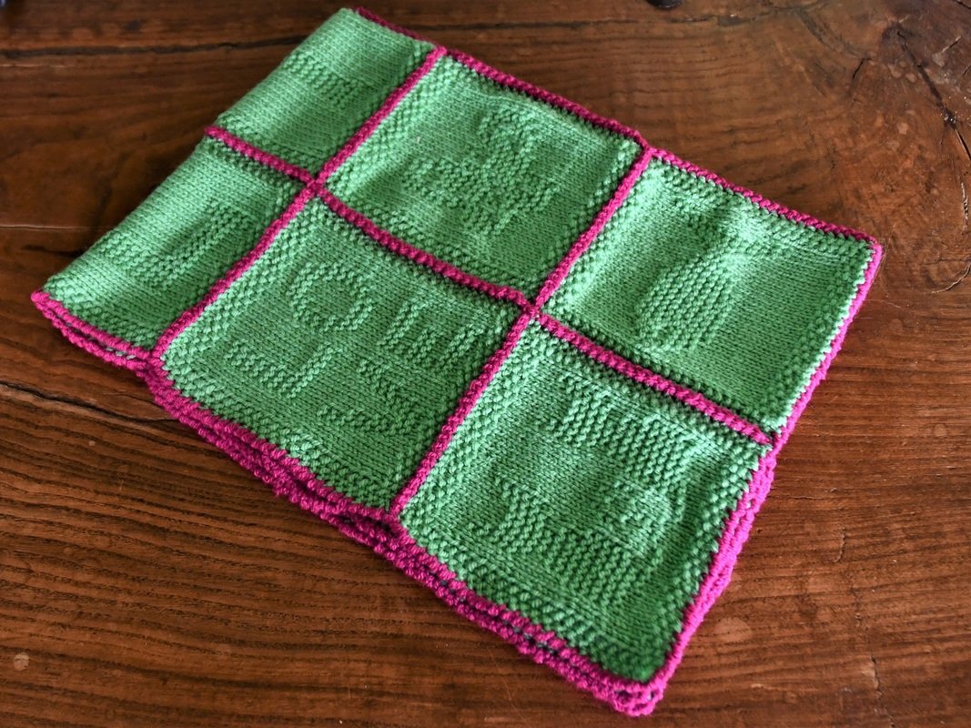 Insgesamt sind es 42 Dateien (1 allgemeine Anleitung für das Stricken und Zusammenfügen der Quadrate, 29 Anleitungen für die einzelnen Buchstaben, 12 Anleitungen für die Motive).