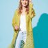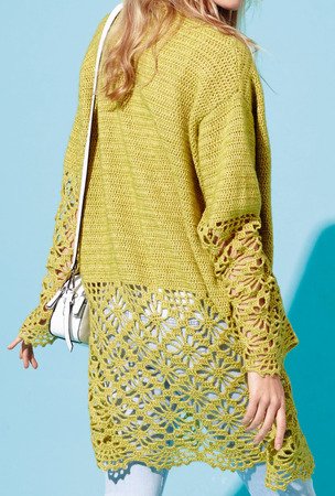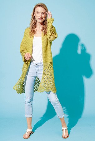 Was für eine schöne Jacke! Verschlusslos und lang ist sie ein wahrer Allrounder. Das weiche Baumwoll Mischgarn mit einem Anteil aus Alpacawolle lässt sich wunderbar häkeln und ist das perfekte Garn für den Übergang. Der obere Teil von Vorder- und Rückenteil sowie von den Ärmeln ist ganz einfach im Stäbchenmuster gehäkelt. Der Ausschnitt ergibt sich durch einen hinteren Schlitz, sodass keine Rundungen gearbeitet werden müssen. Sind die Teile fertig, werden auf die Anschlagkanten die Blenden nach unten gehäkelt. Das Muster aus Luftmaschen und Stäbchen zeigt sich spitzenmäßig. Zum Abschluss und Abrundung wird dann noch eine Reihe aus festen Maschen und Picots gehäkelt. Gehäkelt wird mit Nadel Nr 4. Das Garn ist von Lana Grossa und die Anleitung umfasst die Größen 40, 42 und 44.