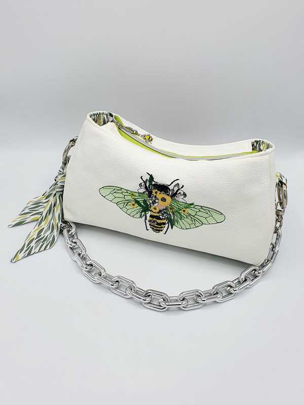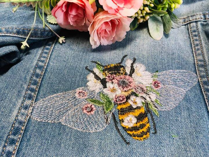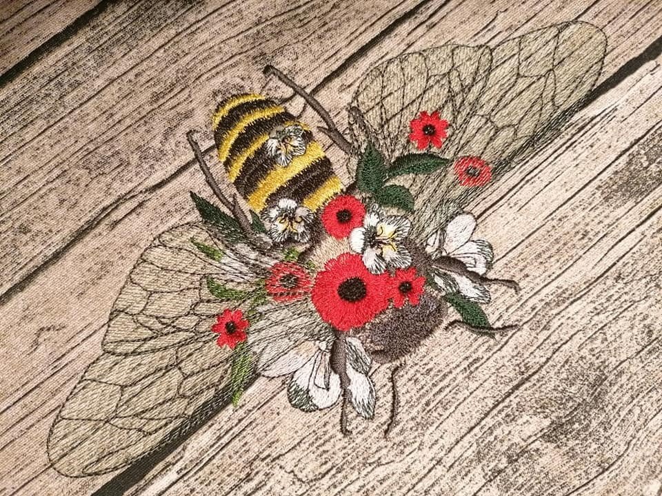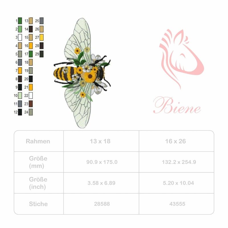Diese florale Biene bringt Leben in dein Stickprojekt – mit ihren transparenten Flügeln, zarten Blüten und der typischen Streifenoptik ist sie ein echter Blickfang.