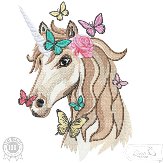 Ein zauberhaftes Einhorn mit bunten Schmetterlingen.