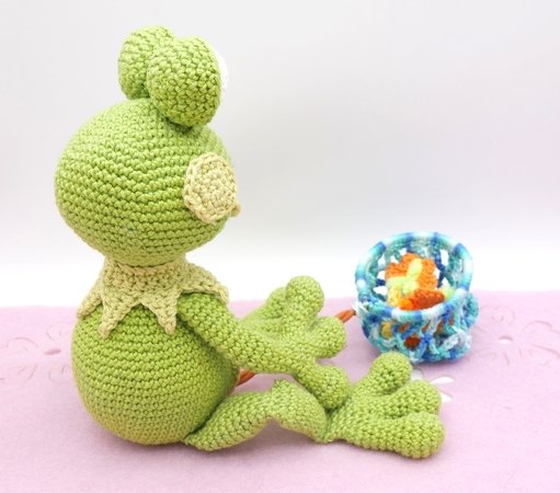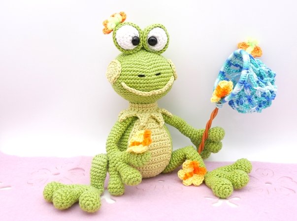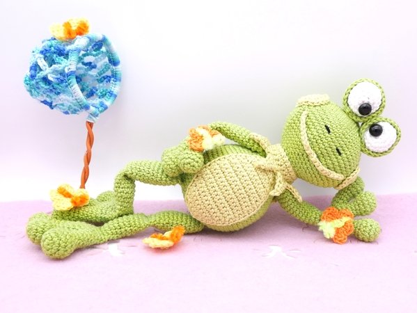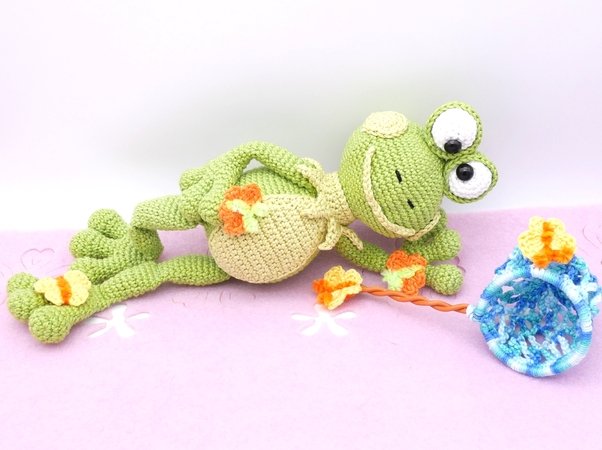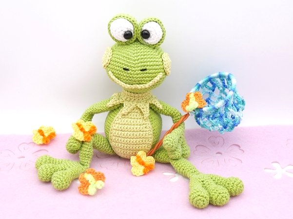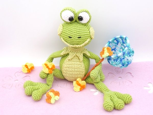 Die Häkelanleitung enthält den Frosch, das Schmetterlingsnetz und die Schmetterlinge.
