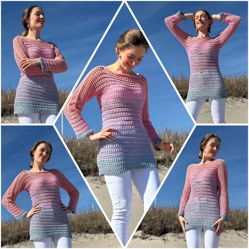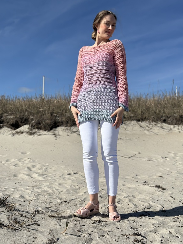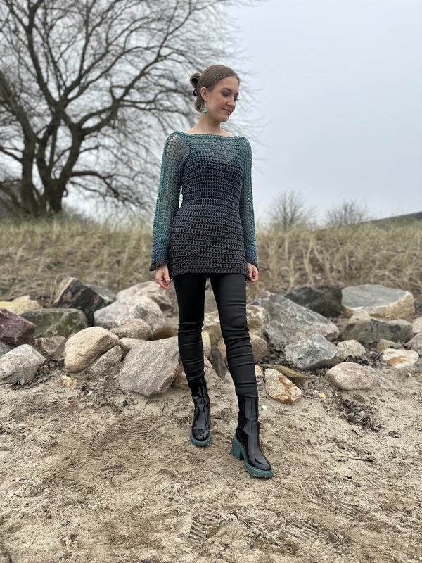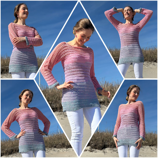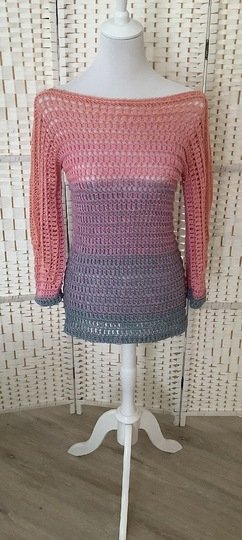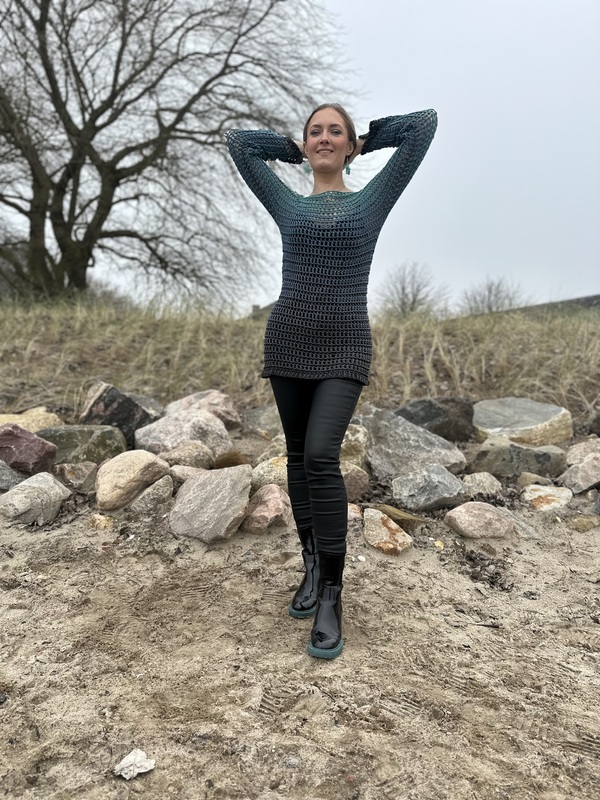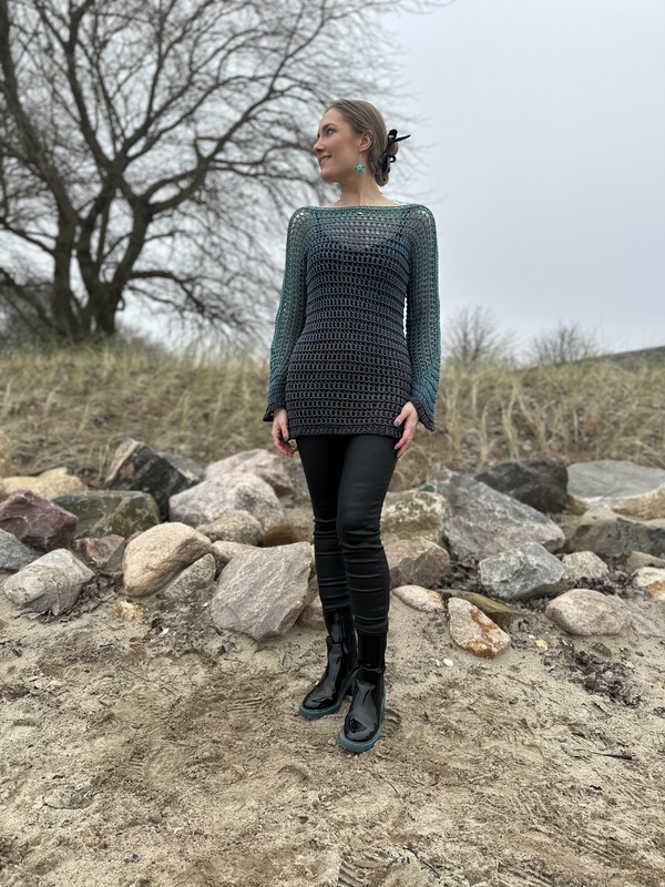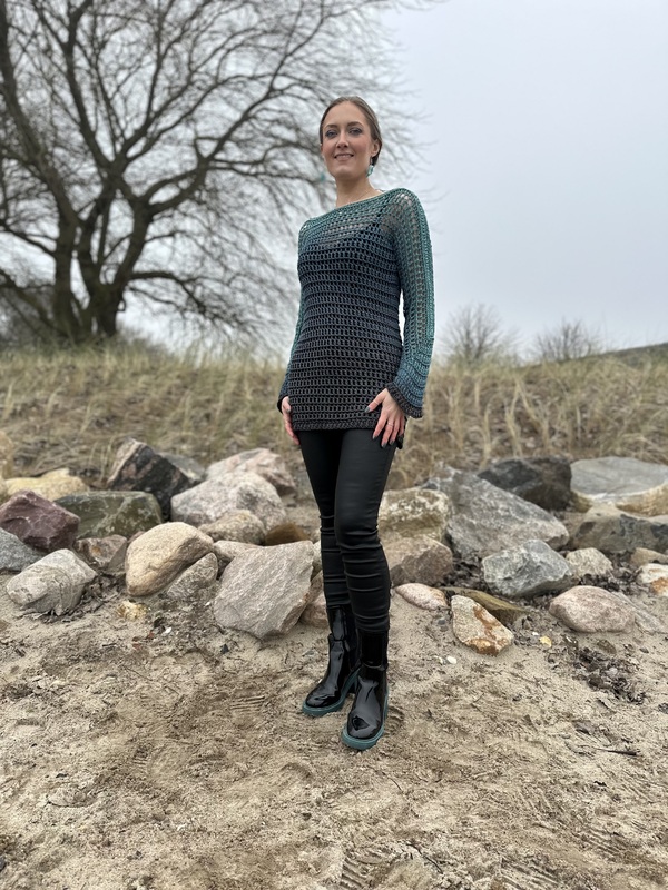 Hier bekommst Du eine Anleitung für den tollen luftig leichten, einzigartigen und wunderschönen 1-Bobbel-Sommerregen-Häkelpulli, der Sommer-Herzen höher schlagen lässt. Wie der Name schon sagt, benötigst Du nur EINEN Bobbel, denn der Häkelpulli wird in einem Stück gehäkelt. Hierfür benötigst Du KEINE extra Bobbel für die Ärmel. Dieser Häkelpulli ist ein echter Hingucker und kann auch als Kleid gearbeitet werden. Du kannst Dein Werk im Alltag oder eben auch zu besonderen Anlässen tragen. Der schöne Sommerregen-Pulli (oder Kleid) ist an jede Größe anpassbar und für nahezu jedes Garn geeignet. Je nach Garnauswahl, kann man den Pulli zu jeder Jahreszeit tragen. Besonders gut eignen sich hier Farbverlaufsgarne/ Bobbel, weil sie mit einem Rutsch von der Häkelnadel hüpfen. Viel Spaß beim Nachmachen und gutes Gelingen.
