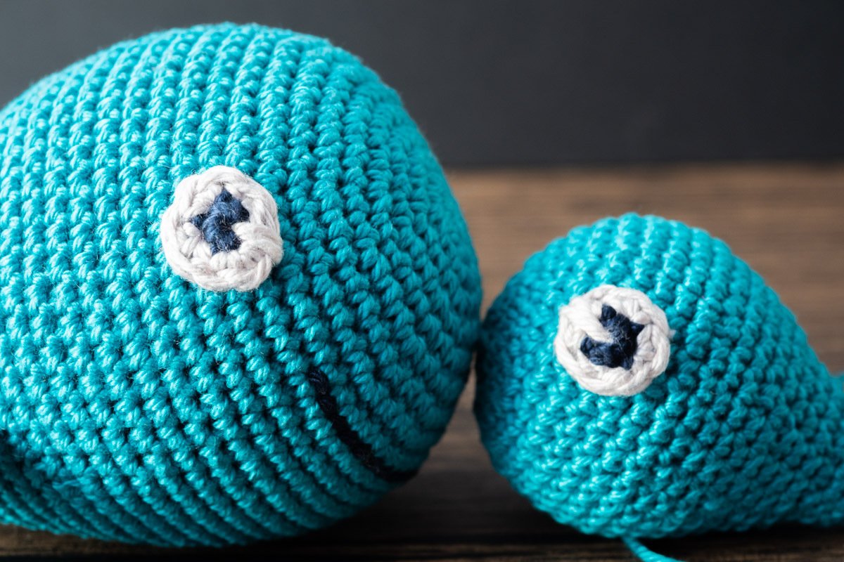 Häkeln kannst du die Walmama mit Kind oder Kindern aus jedem beliebigen Garn. Wichtig ist nur, dass deine Nadelstärke zum Garn passt. Nutze hierfür die kleinstmögliche Nadelstärke und beachte, dass sich die Größe des fertigen Wals mit dem Garn ändern kann.