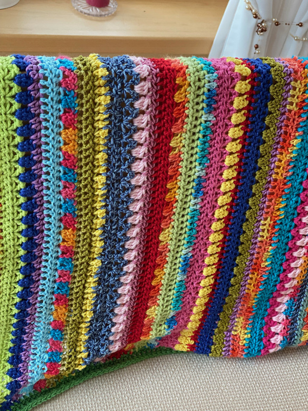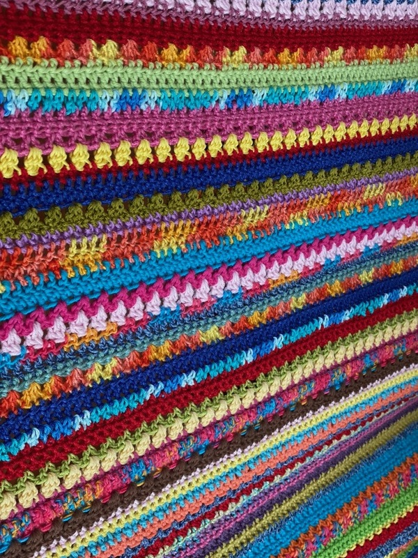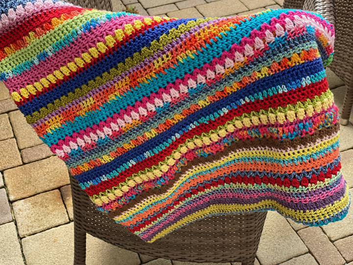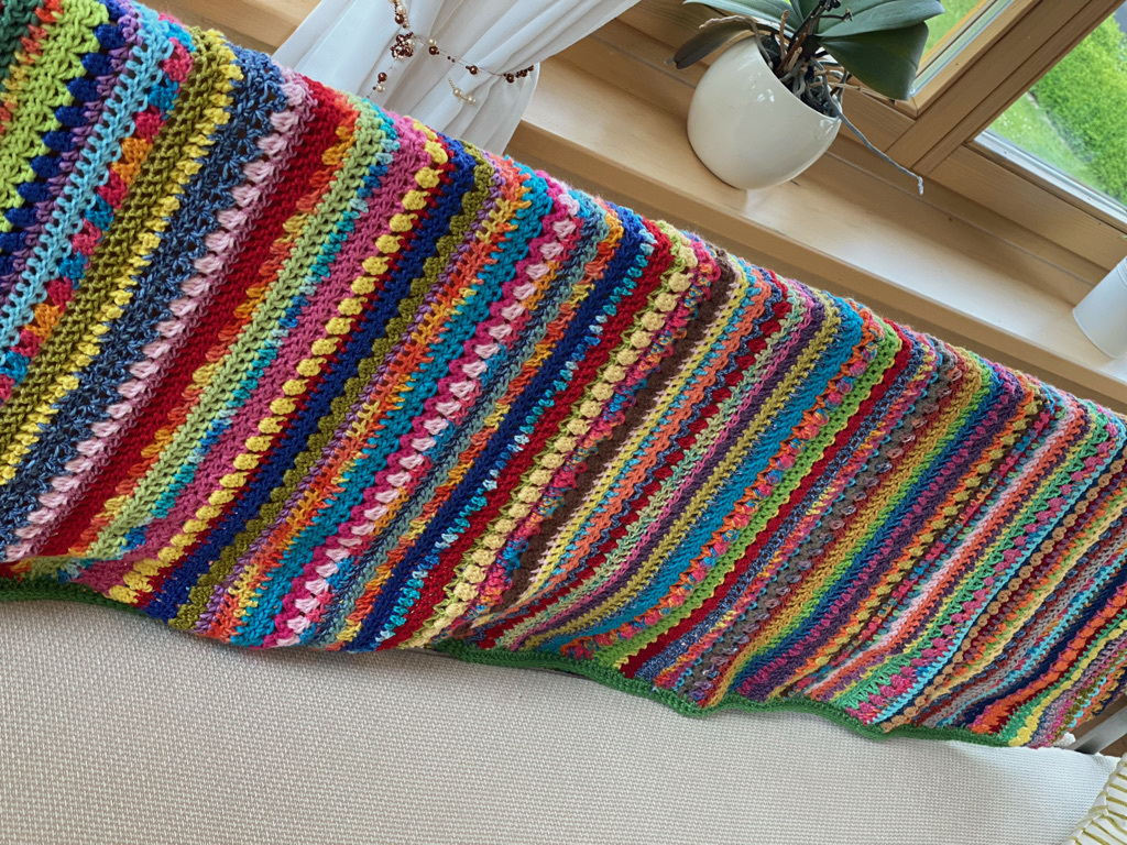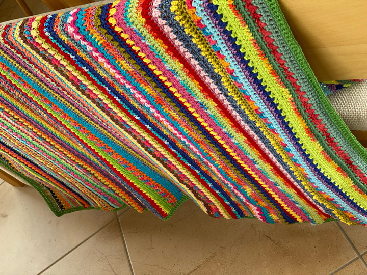 Du hast auch zuviel Woll-Reste? Bei dieser Decke kannst Du sie wunderbar verarbeiten und erhältst gleichzeitig eine fröhliche Häkel-Decke, für kühle Sommerabende auf Balkon, Terrasse oder im Garten oder einfach als wunderschöne Deko.
