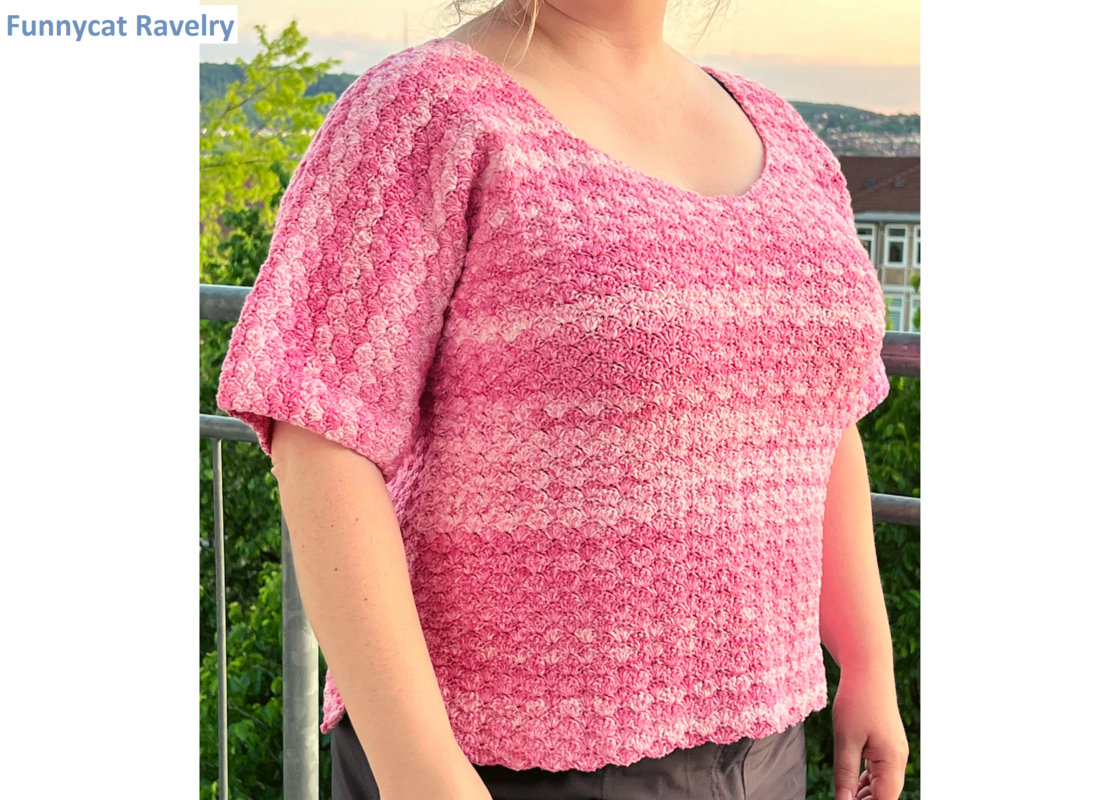 Mit der Muschel-Tee Anleitung enthältst du außerdem wichtige Tipps für ein gut passendes Shirt: Wichtigkeit der richtigen Maschenprobe und Auswahl der richtigen Größe. Dieses Sommertop wird komplett im Muschelmuster gehäkelt, was schon seit langem mein Lieblingsmuster ist.