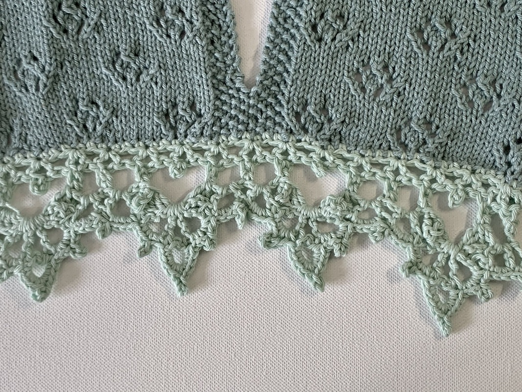 Ich habe damals 106 Maschen angeschlagen und musste zuletzt bei der Häkelborte etwas üben, bis es einigermassen aufging.
