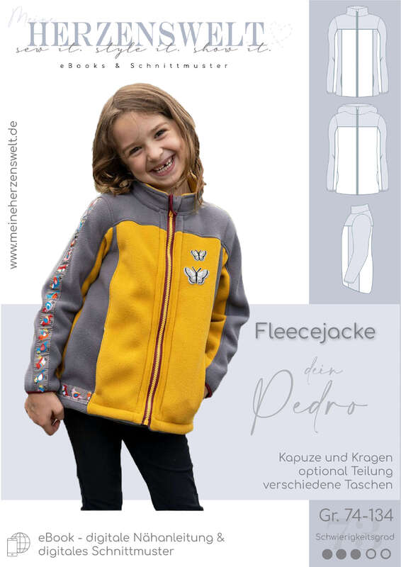 Pedro ist ein Schnittmuster für eine sportliche Fleecejacke mit tollen Extras wie z. B. zwei verschiedenen Taschenvarianten, Kragen oder Kapuze und Gummizug in Kapuze und Saum.
