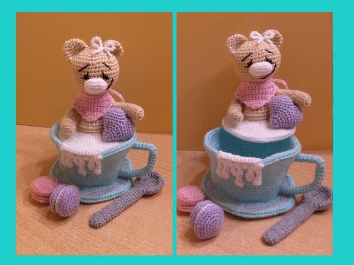Zur Dekoration, als Geschenk mit z.B. Pralinen, als Geheimversteck, oder als Dankeschön. Die Anleitung besteht aus der Tasse mit Bär, Löffel, Macarons und dem kleinen Herz ❤.