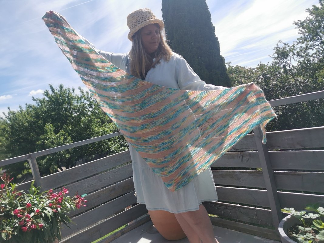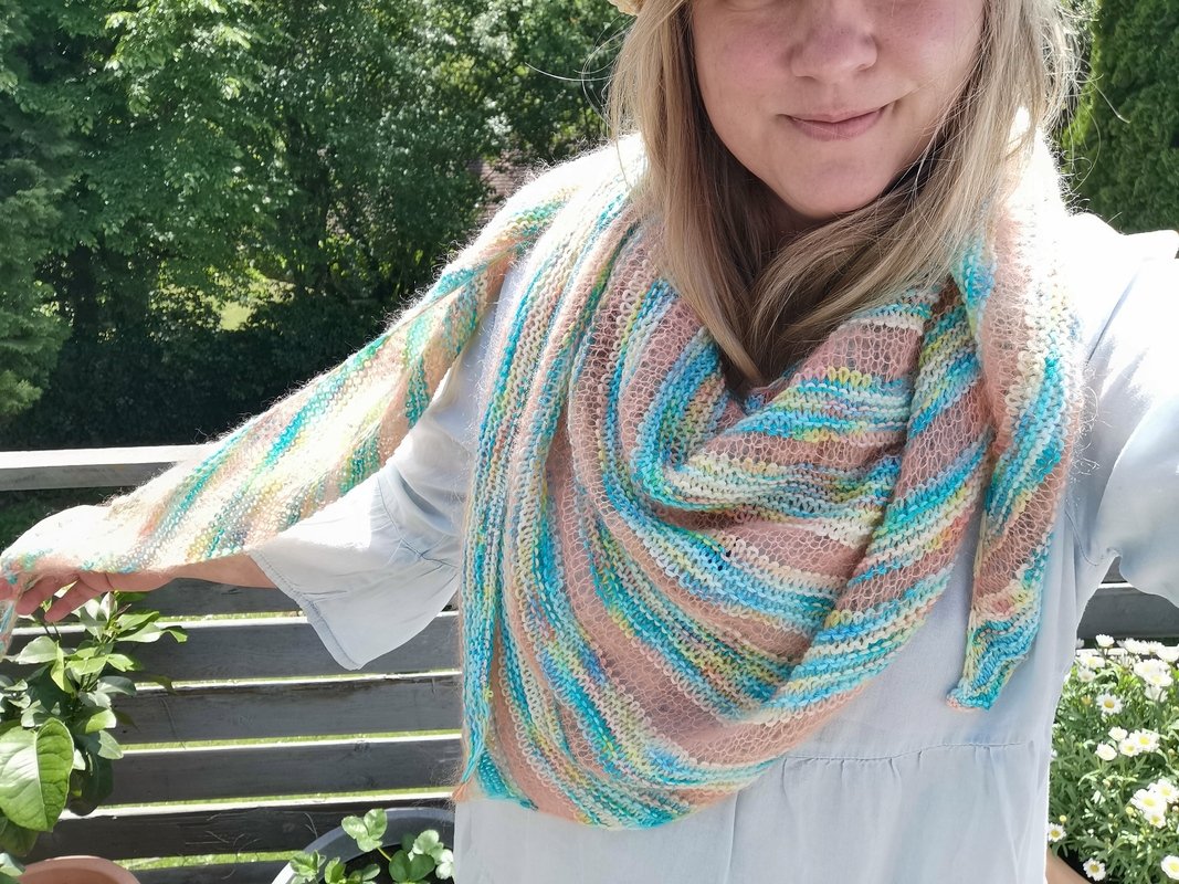 Durch den Wechsel von einem Merinogarn und einem Mohairgarn entseht eine ganz besondere Leichtigkeit, weshalb sich dieses Tuch auch super für laue Sommerabende eignet.