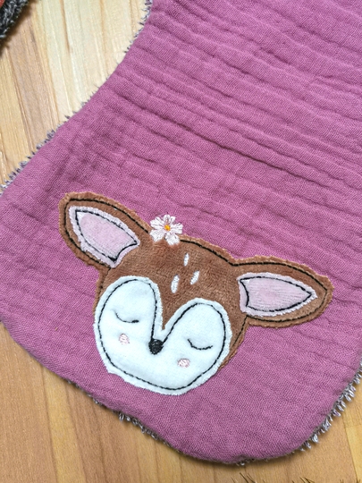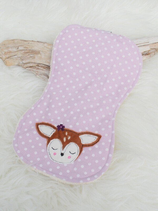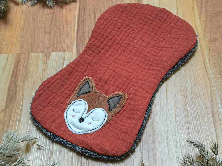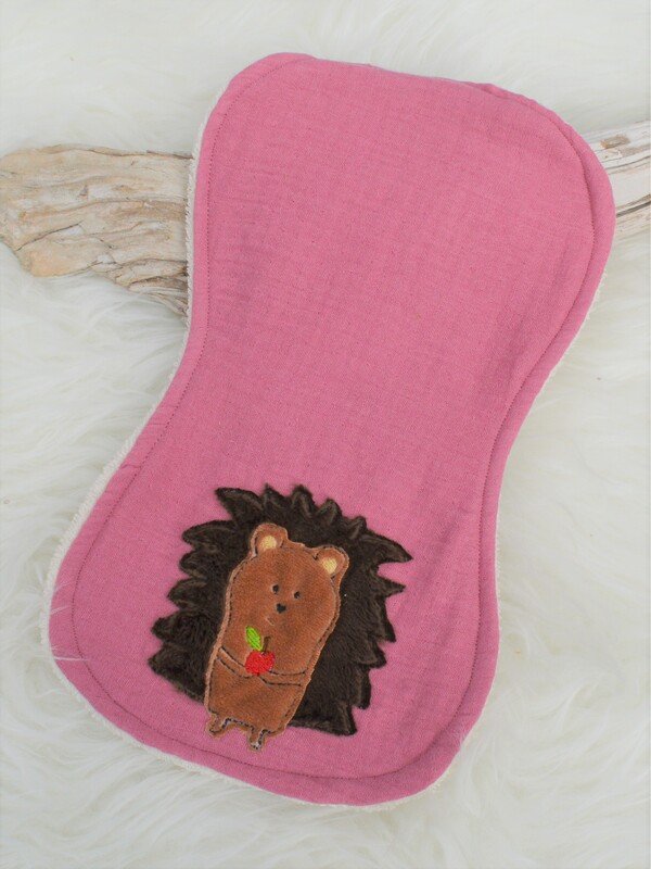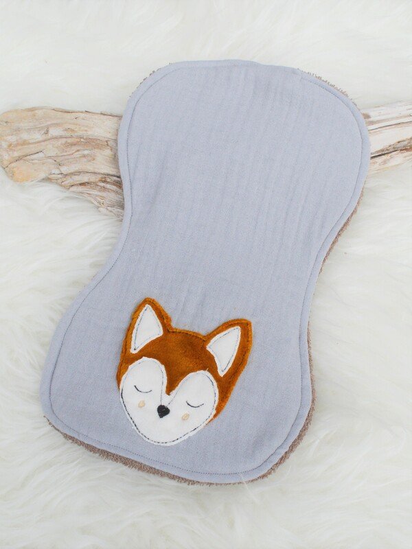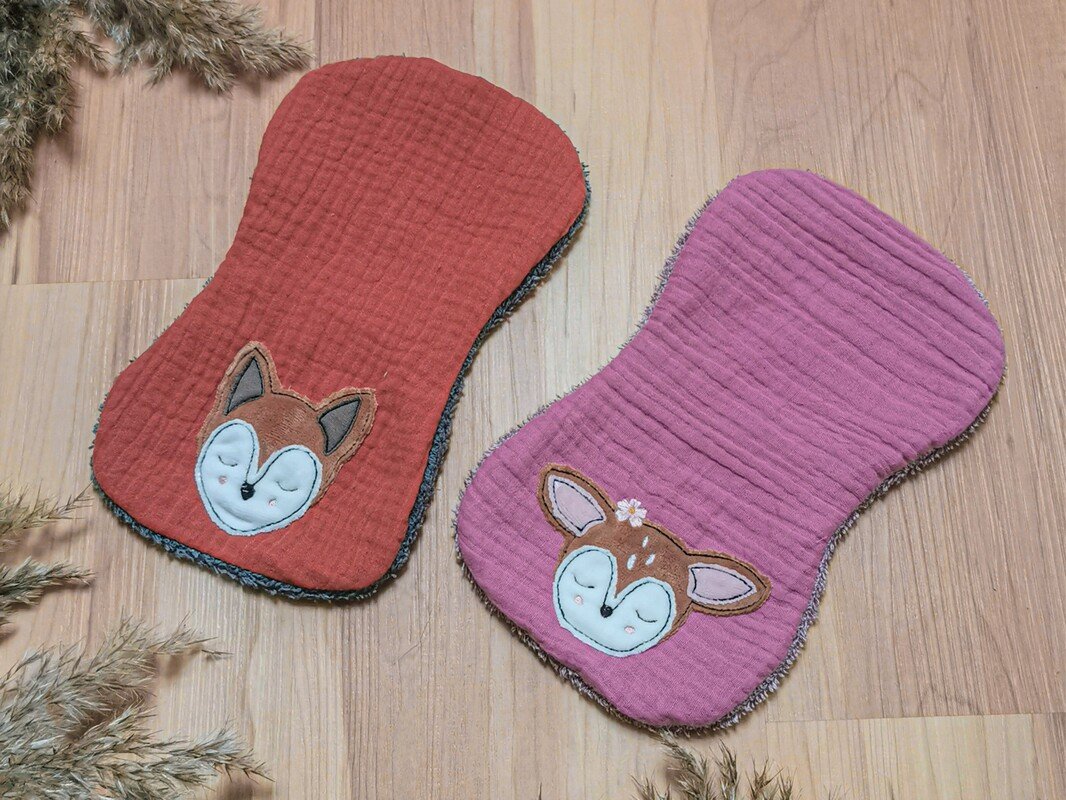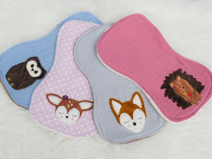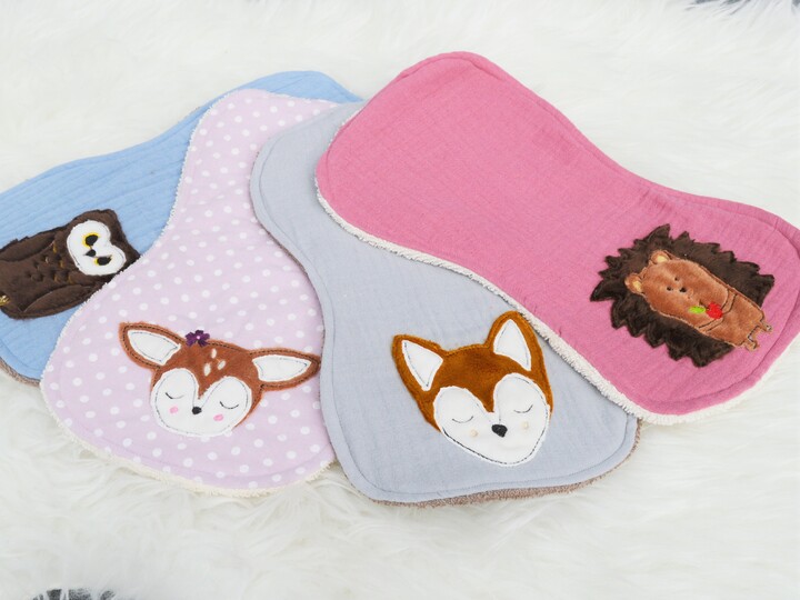 Dem ZIP sind 4erlei Varianten enthalten: Spucktuch mit Kauz, Reh, Fuchs, Igel.