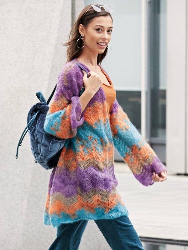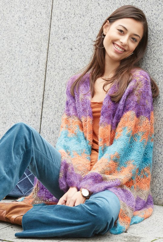 Was für eine Jacke! Der wunderschöne Farbverlauf lässt gute Laune aufkommen. Locker und weit mit wunderbaren Fall umspielt die Jacke den Körper. Das Muster ist einfach zu arbeiten und ergibt den schönen Wellensaum. Der Schnitt ganz gerade entsteht hier die schöne A-Linie durch Abnahmen innerhalb des Musters. Hier werden einfach Maschen zusammen gehäkelt, sodass am Außenrand keine Abnahmen gearbeitet werden müssen. Die Ärmel sind extra weit und von unten nach oben gerade gearbeitet. Auch für den Ausschnitt müssen keine Abnahmen gehäkelt werden. Die Enden der Vorderteile fallen am Ausschnitt wie ein kleines Reverse um. Es wird mit Nadel Nr 4 und einem federleichten Garn von Lana Grossa gearbeitet. Die Anleitung gilt die die Einheitsgröße 40-44.