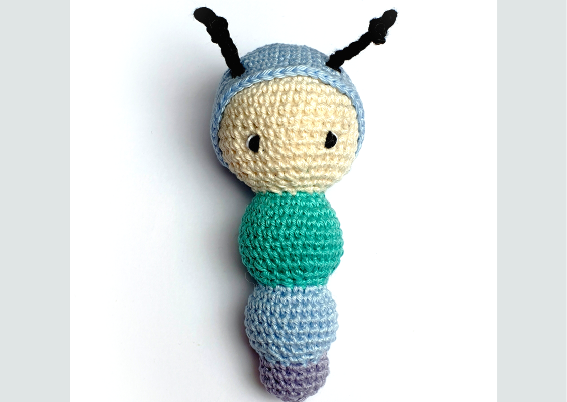 Ich habe mit „Schachenmayr Catania“ und der Häkelnadel 2,5 mm gearbeitet, dann wird deine Rasselraupe ca. 14 cm groß.