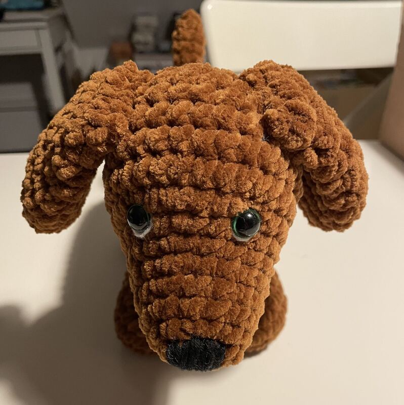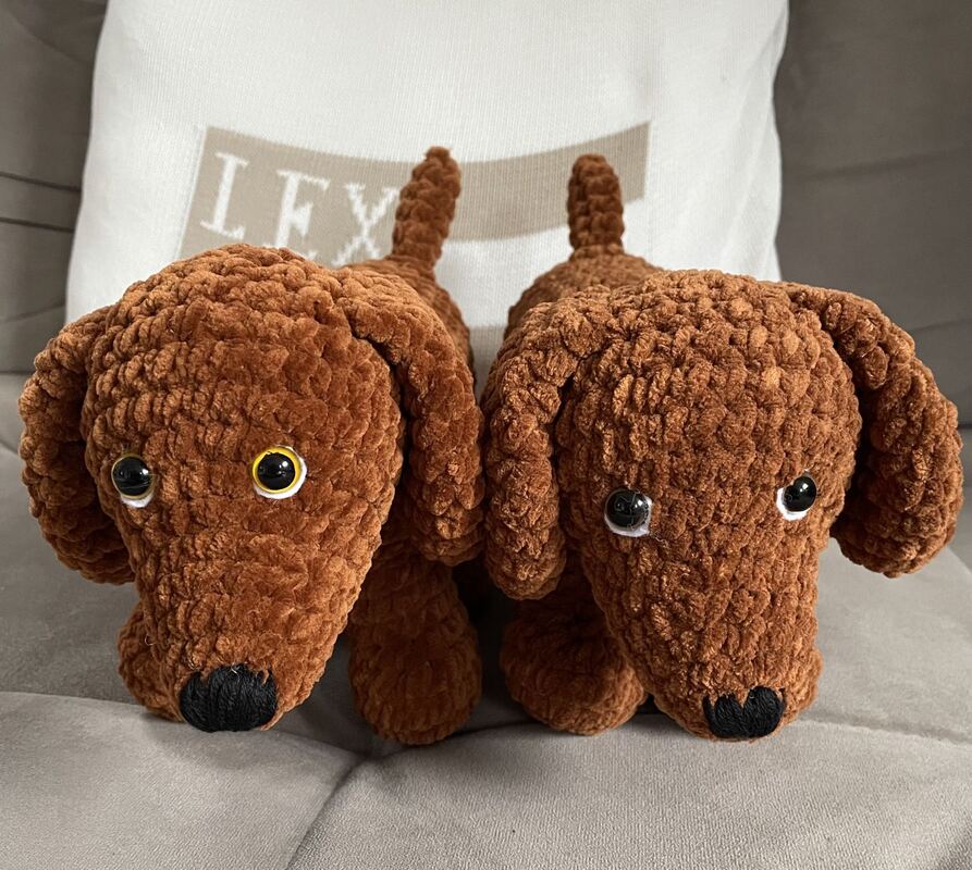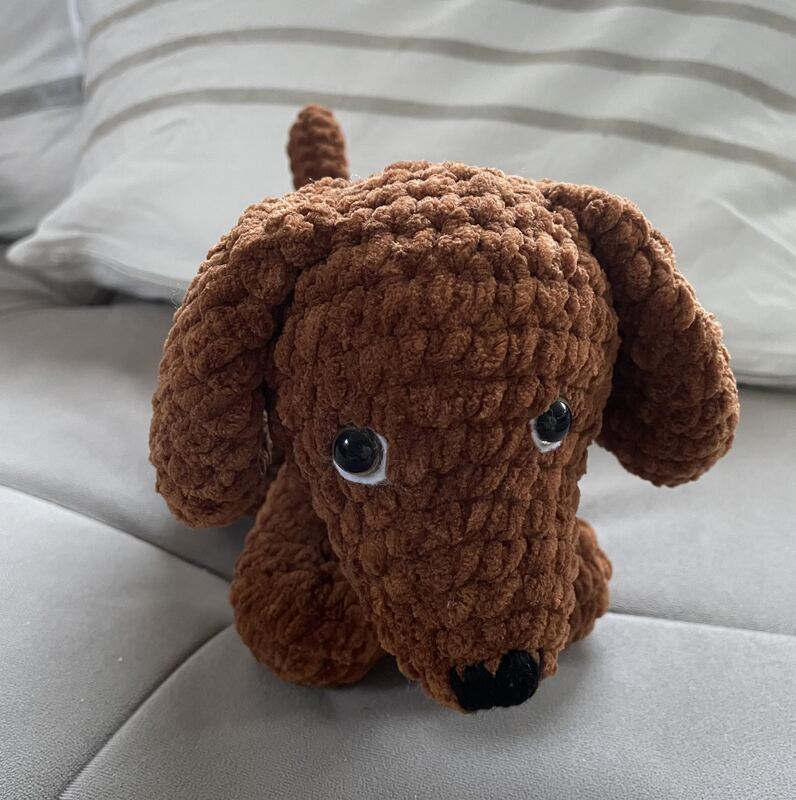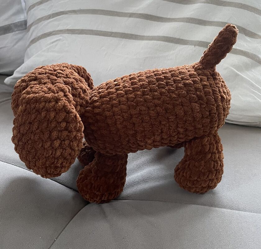 Häkelanleitung für einen süßen Dackel aus weicher Chenillewolle
