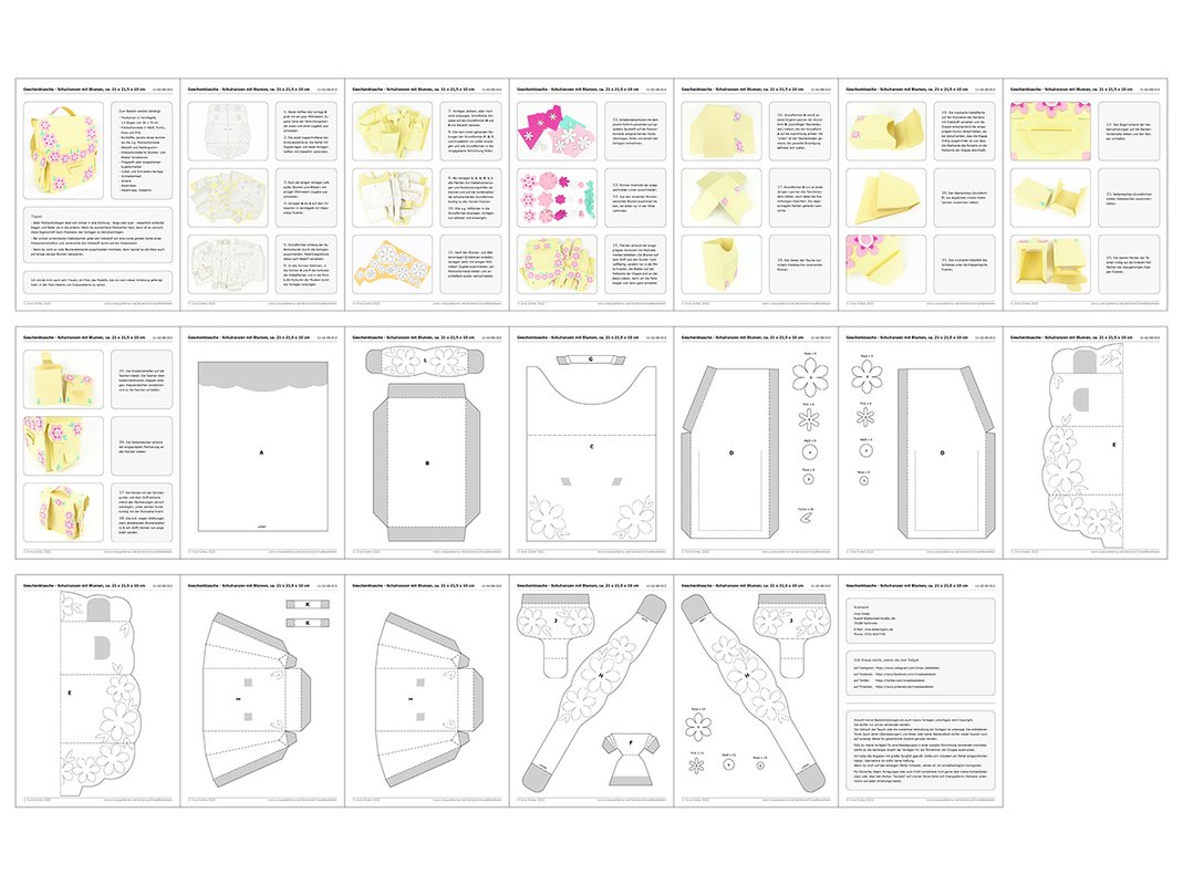 Zum Basteln dieser Geschenktasche sollst du mit Schere, Cutter und Schneidelineal umgehen können, wissen, wie man Faltlinien einprägt und Grundformen faltet. Auch sollst du bereits mit Klebstoff gearbeitet haben. Grundsätzlich wäre hier etwas mehr Erfahrung im Basteln von räumlichen Papierobjekten von großem Vorteil.