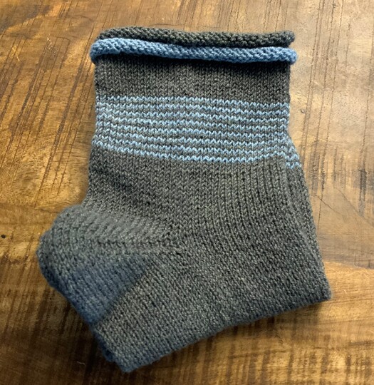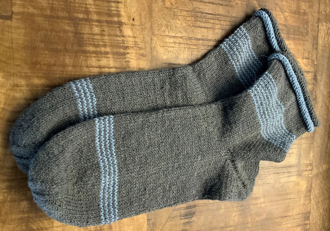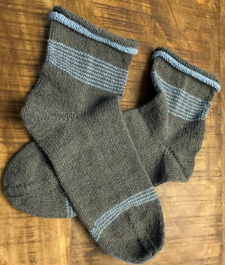 „Abella“, schöne Socken in glatt rechts mit ein paar Ringeln und einem doppelten Röllchenrand. Die Socken werden von oben nach unten gestrickt. Die Grundlagen des Sockenstrickens sollten bekannt sein. Ich habe die Ferse als Bumerangferse gearbeitet und eine Bandspitze gestrickt und beschrieben. Ferse und auch Spitze können jedoch auch anders ausgeführt werden