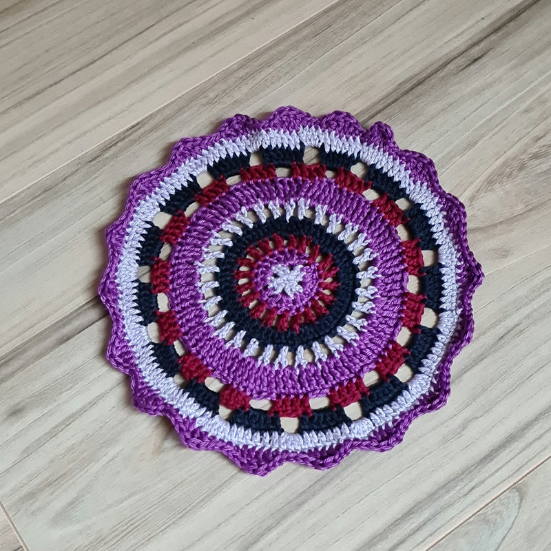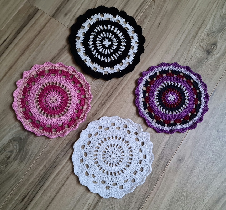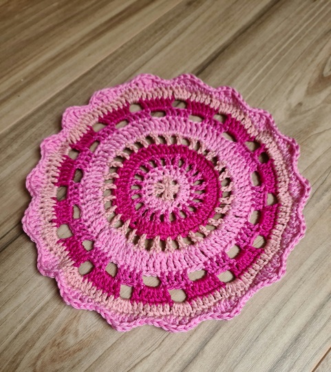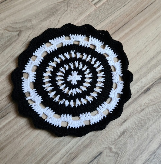 Das Deckchen hat einen Durchmesser von 18 cm und ist aus 100 % Baumwollgarn gefertigt.