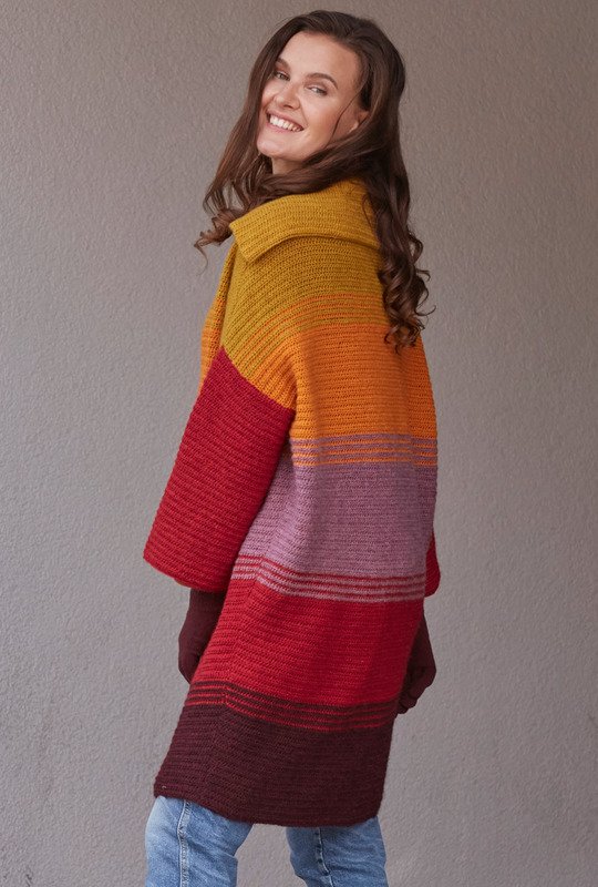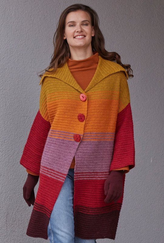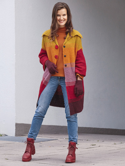 Das kommt gute Laune auf. Diese wunderschöne, lange Jacke, auch als Kurzmantel tragbar, ist mit sechs Farben in Rot- und Gelbtönen gehäkelt. Das Muster ist simpel: Du häkelst in halben Stäbchen. Auch ist der Schnitt recht einfach, du musst nur an den Seiten für die obere Weite zunehmen und für die tiefe Schulterschrägung abnehmen. Der übergroße Kragen wird nach dem Schließen der Schulternähte ebenso im Halbstäbchenmuster angehäkelt. Durch die Zunahmen an den Außenkanten fällt er beim Tragen gut über die Schultern. Das Garn bekommst du bei Lana Grossa und häkelst mit Nadelstärke Nr 3,5. In der Anleitung findest du die Größen 36, 38, 40, 42, 44 und 46.