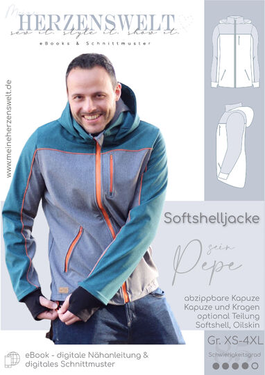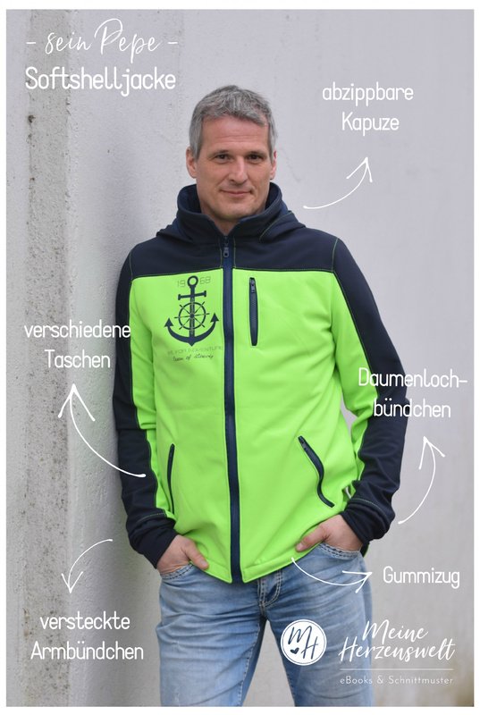Mit dem Schnittmuster „sein Pepe“ kannst du eine praktische Softshelljacke nähen. Durch die Teilung im oberen Brust- und Rücken- sowie im Armbereich hast du die Möglichkeit Stoffe miteinander zu kombinieren, gerade Uni-Stoffe kommen hier super zur Geltung. Im Schnittmuster sind noch tolle Zusätze wie eine abnehmbare Kapuze, versteckte Daumenlochbündchen, Gummizug in Kapuze und Saum und mehrere Taschenvarianten vorhanden.