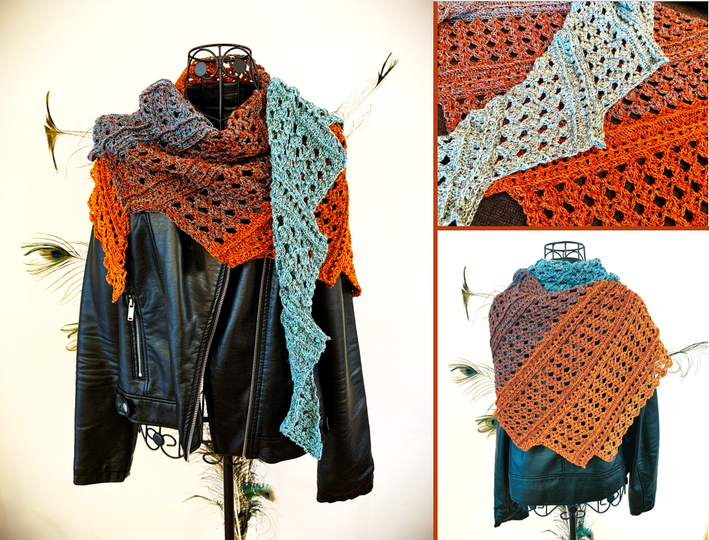 Verwendete Wolle: Yvies Dreamies (in der gleichnamigen Facebook Gruppe erhältlich), 4-fädiger Bobbel, 1300 m Lauflänge, 375 g, 50% Baumwolle, 50% Polyacryl, Farbe: Orient; ca. 1040 m des Bobbel wurden verbraucht; jeder andere Bobbel kann genauso für das Tuch verwendet werden.