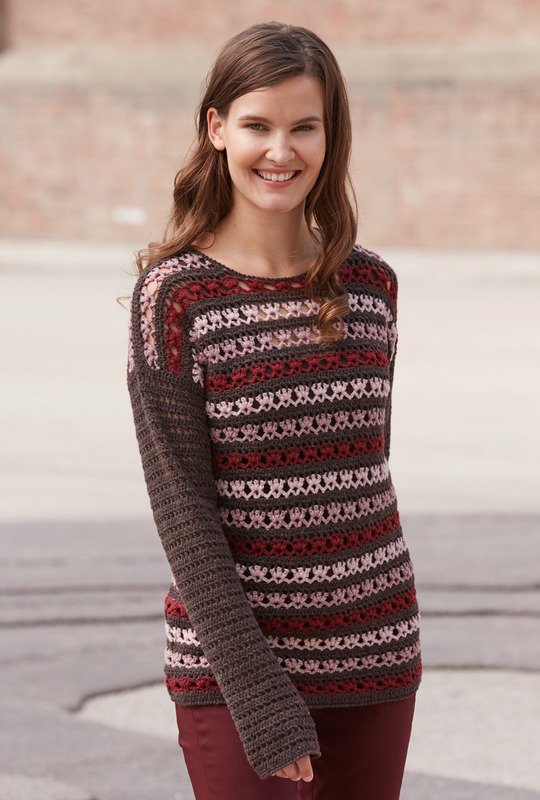 Drei Rottöne geben diesem braunen, gehäkelten Pullover Farbe. Das Grundmuster ist eigentlich leicht zu häkeln. Es wechseln sich immer Stäbchenreihen mit Büschelmaschenreihen ab. Jeweils zwei Reihen in einer Farbe gehäkelt ergeben die schmalen Streifen. Auffällig sind hier die braunen Maschen, die in die darunterliegende Farbe gearbeitet werden. Da die langen Ärmel in uni Braun erscheinen setzen sie die Streifen zusätzlich in Szene. Das Garn bekommst du bei Lana Grossa und arbeitest es mit Nadelstärke Nr 3,5. In der Anleitung findest du die Größen 34, 36, 38, 40, 42 und 44.
