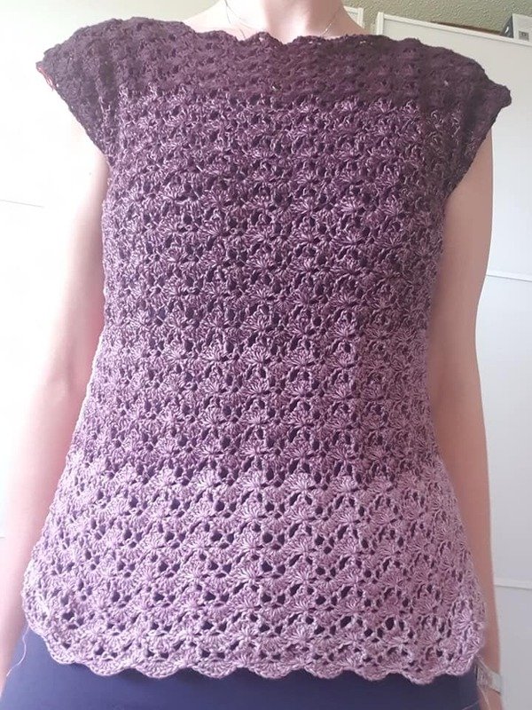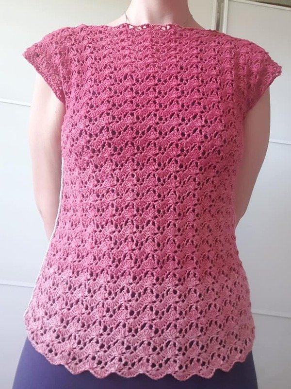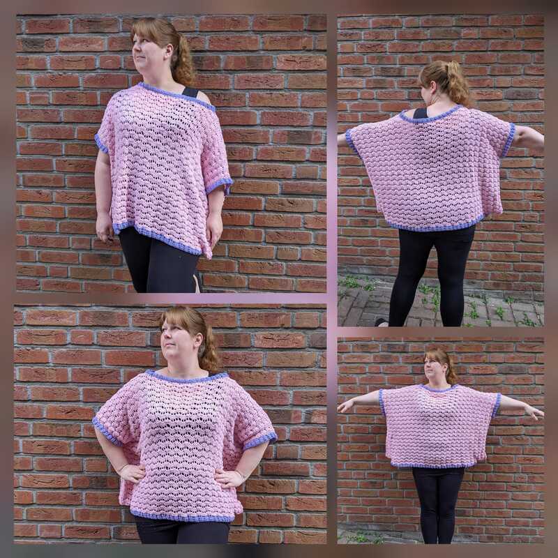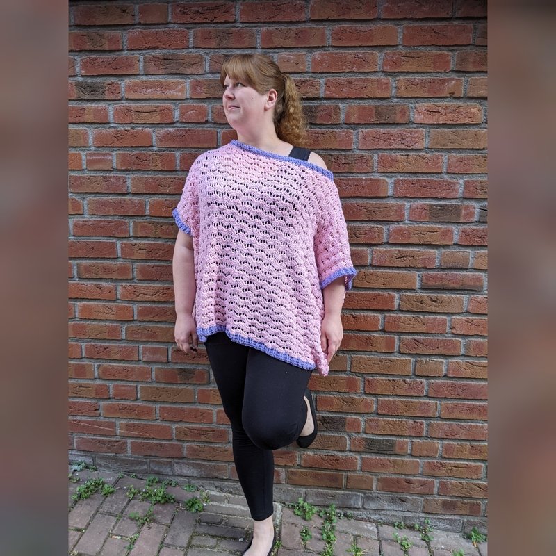 Wir häkeln erst das Vorderteil (inklusive Arme), arbeiten dann von der Schulter aus zum Rückenteil und nähen anschließend die Seitenteile zusammen. Das Bündchen kann abschließend gehäkelt werden.