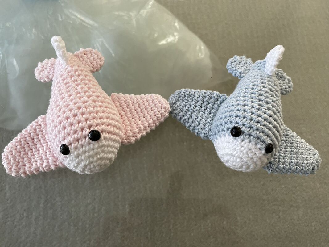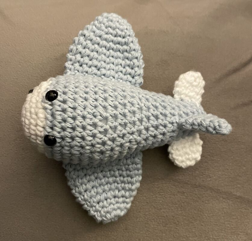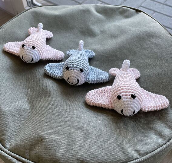 Material: Chenillewolle blau / weiß (1x100g), Reste von schwarzem Baumwollgarn für den Mund /// Alternativ: normales Baumwollgarn (Myboshi No.2) 50g – für kleinere Flugzeuge