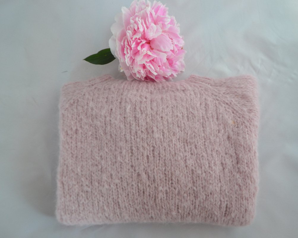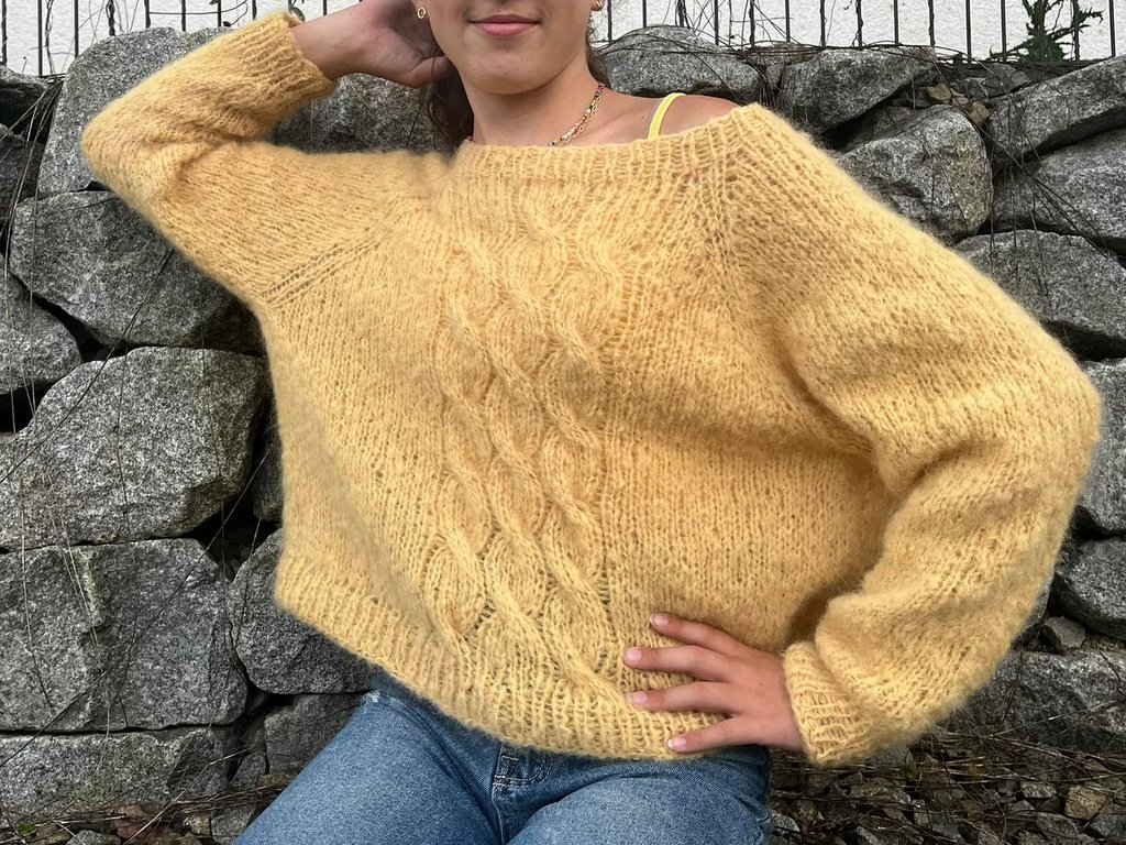 Der Pullover wird von oben nach unten in einem Stück, komplett ohne Nähte, gestrickt.