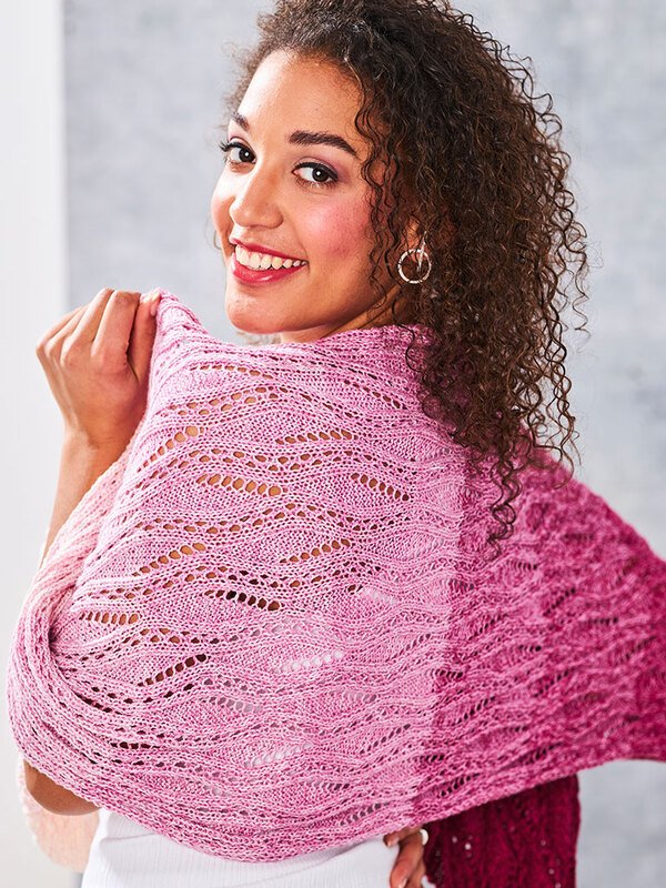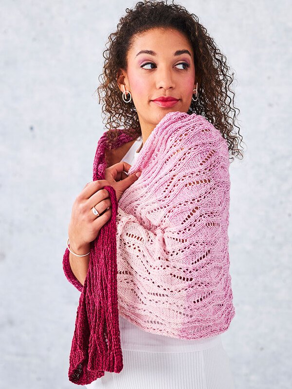 Diese Farben! Der Bobbel aus der Woolly Hugs Reihe Cotton XXL ist echt ein Hammer! Zusammen mit dem Muster "Blätterwellen" zeigt diese Stola eine wunderschöne Blüte die an die Farben einer Magnolie eerinnert. Die Blätter werden von einem Lochmuster umrahmt, welches sich wellenförmig von Blatt zu Blatt bewegt. Die Stola wird hat eine perfekte Größe und ein ganzer Bobbel kann gut aufgebraucht werden.