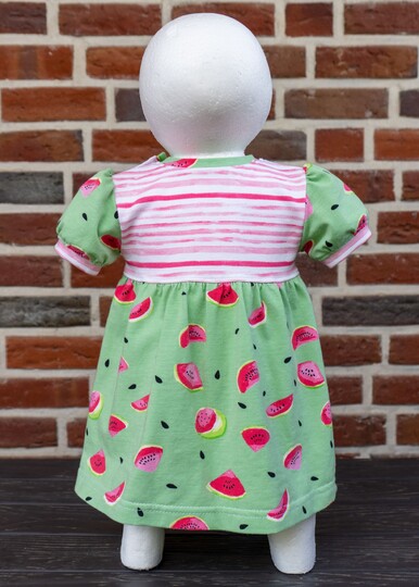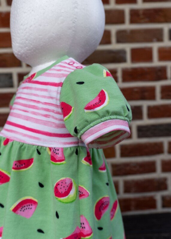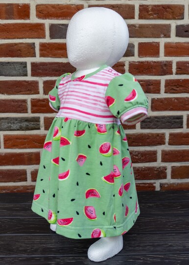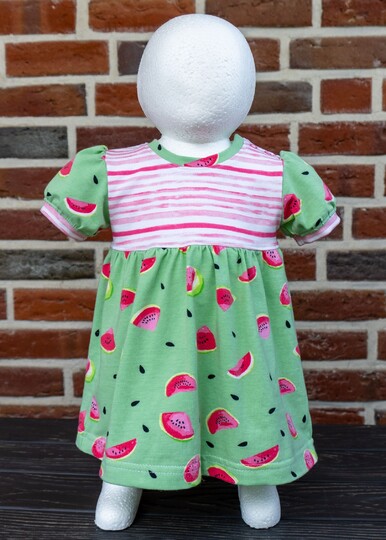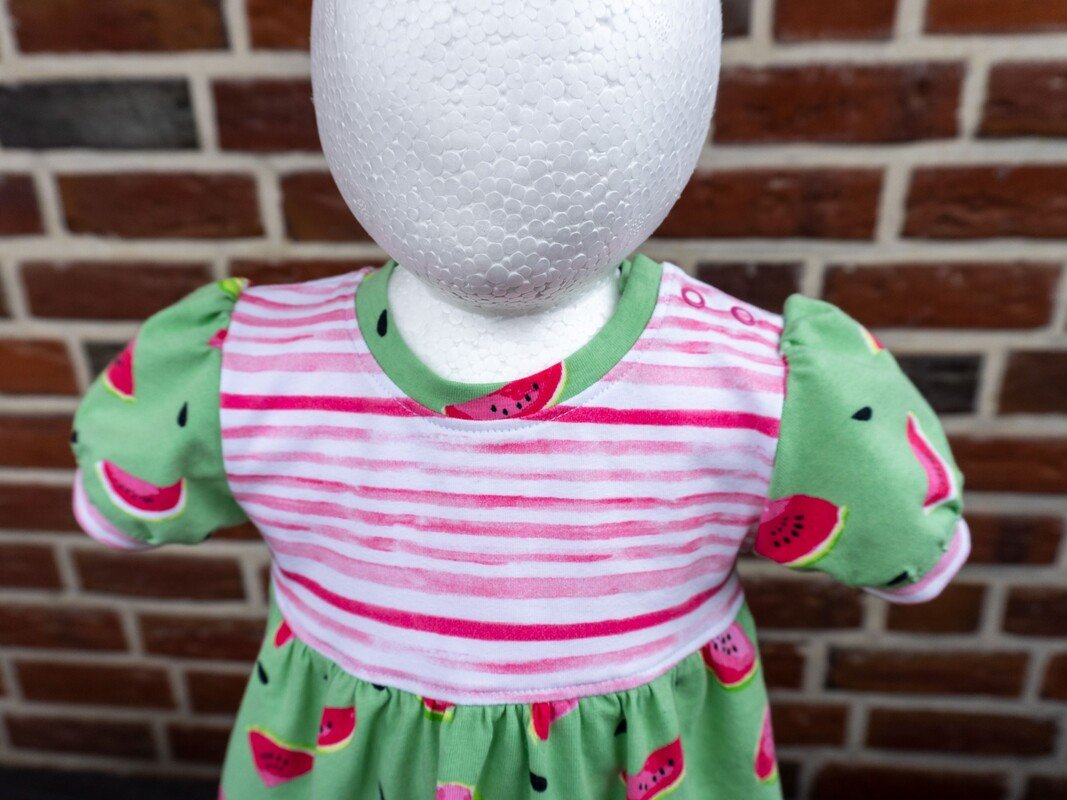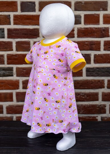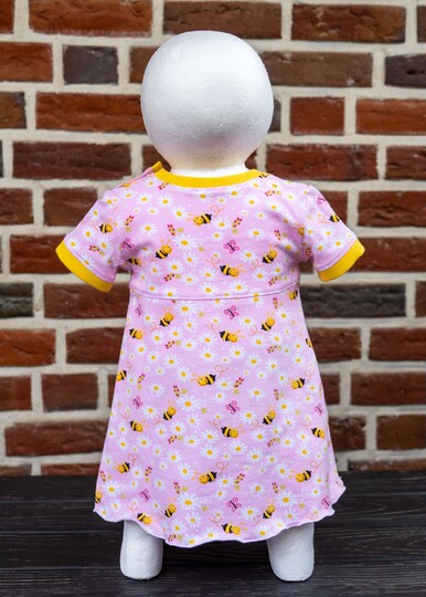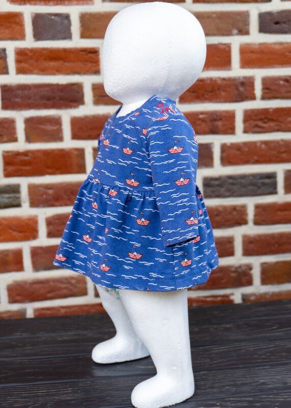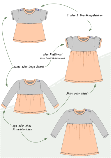 Im Schnittmuster sind einfache, gerade Ärmel in kurz oder lang sowie kurze Puffärmel mit Saumbündchen enthalten. Damit das Kleid leicht übergezogen werden kann, ist an der Schulter eine Knopfleiste eingearbeitet. Du kannst wählen, ob du an einer Schulter oder an beiden Schultern die Knopfleiste einarbeitest. Beide Varianten werden ausführlich als Bild-für-Bild-Anleitung beschrieben, sodass auch Nähanfänger sich an das Kleid trauen können.